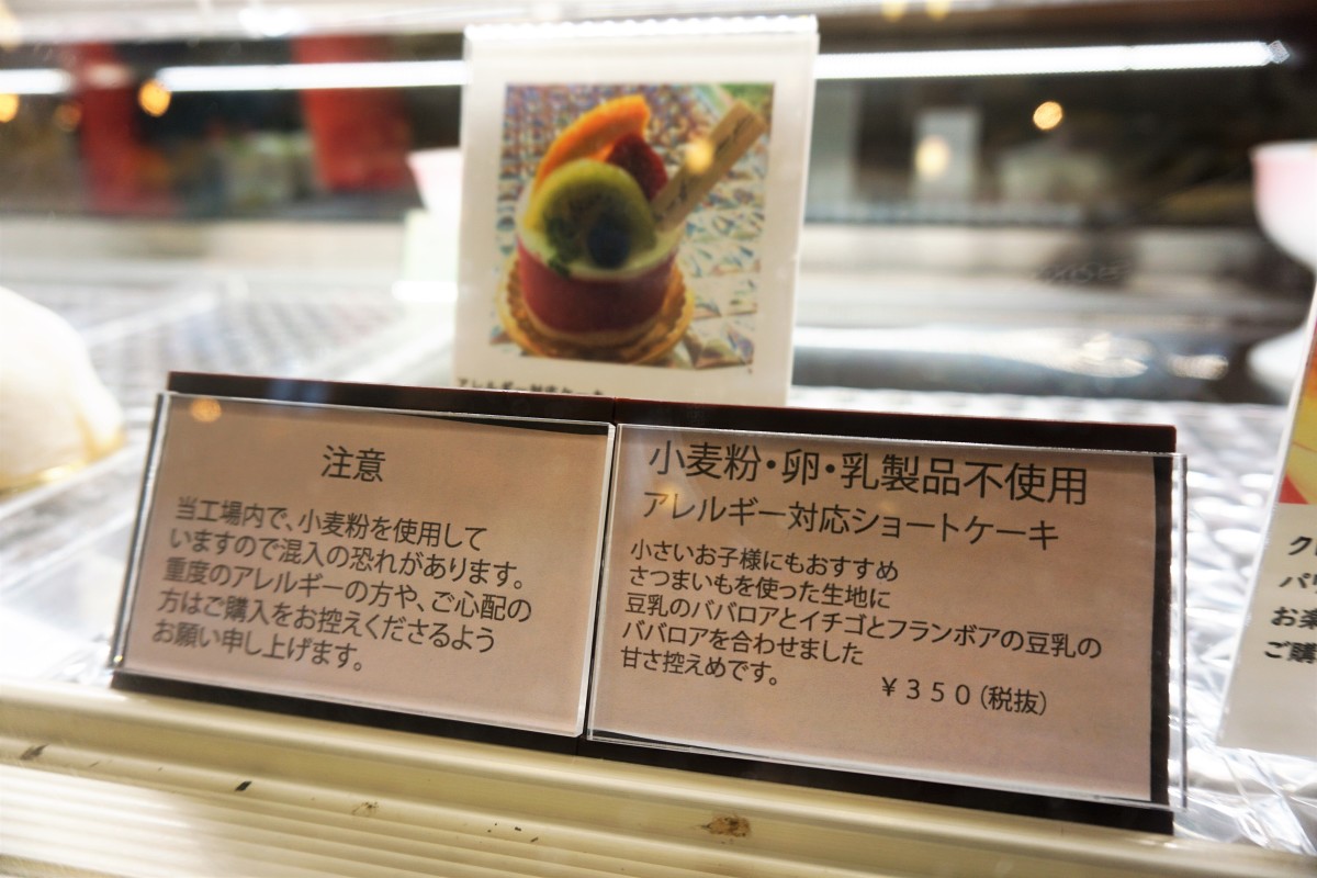 アレルギー対応(小麦粉・乳・たまご)ショートケーキあり、ホールのご予約は2週間前にご予約ください。アレルギーがたまごのみの場合は2週間前のご予約期限を過ぎても、一度ご相談いただければ可能な限り対応いたします。