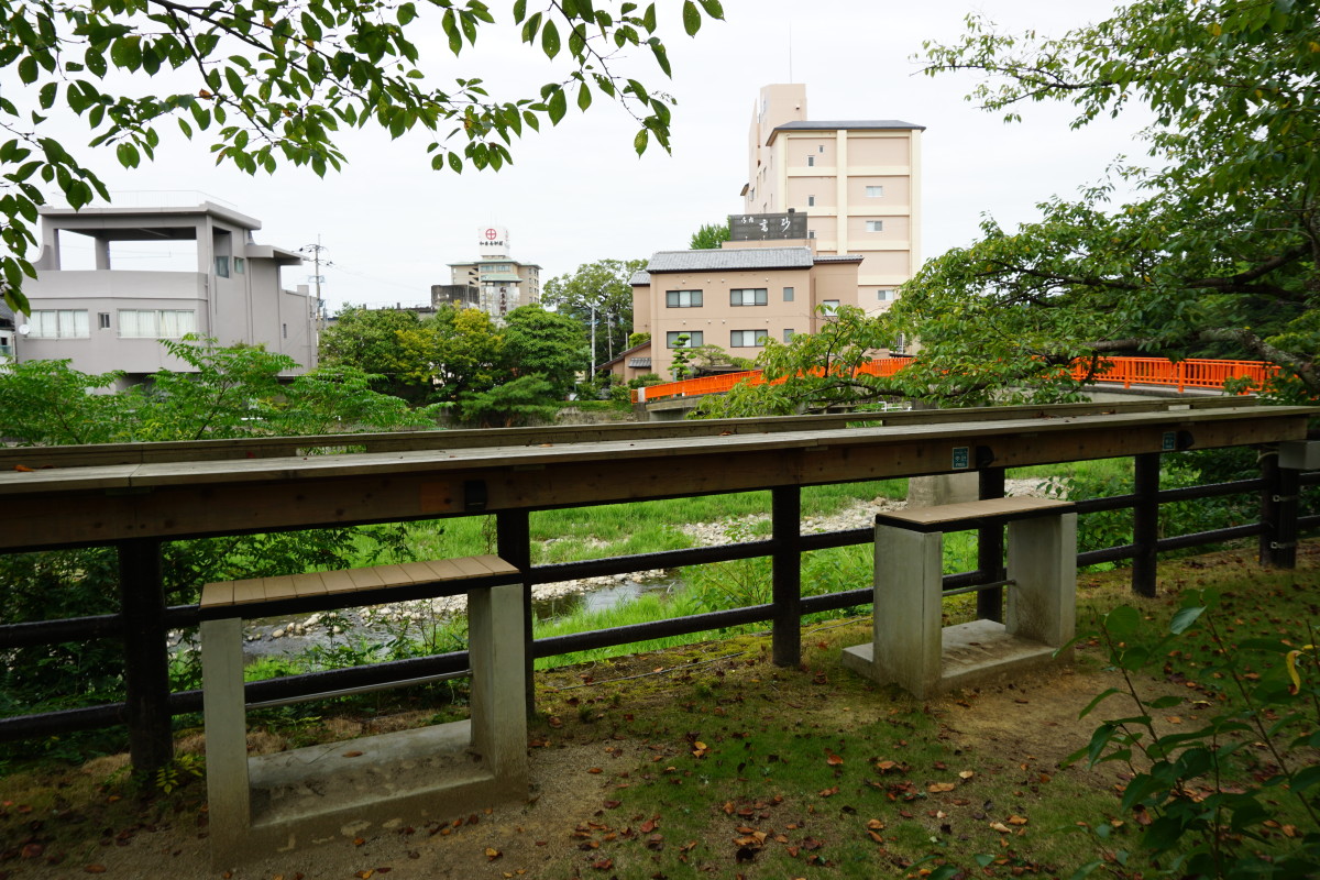 川にかかる朱色の温泉橋の眺めは風情があり、春には桜が楽しめます。