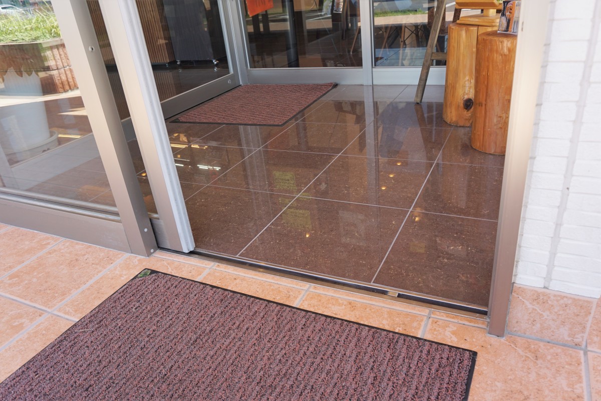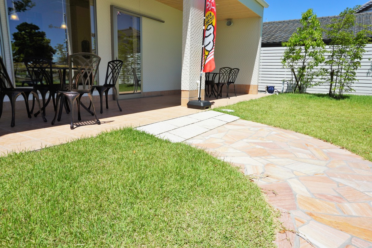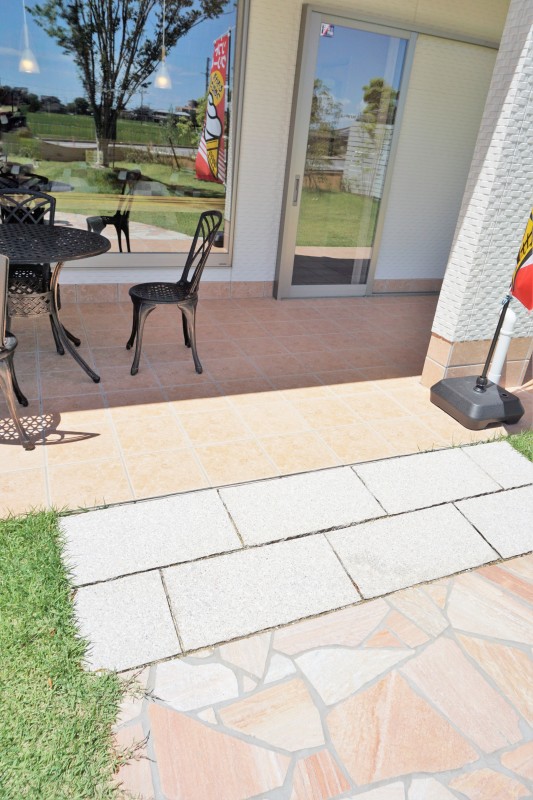 庭を通るゆるやかなスロープあり。トイレ、カフェスペース側の入り口より入店できます。