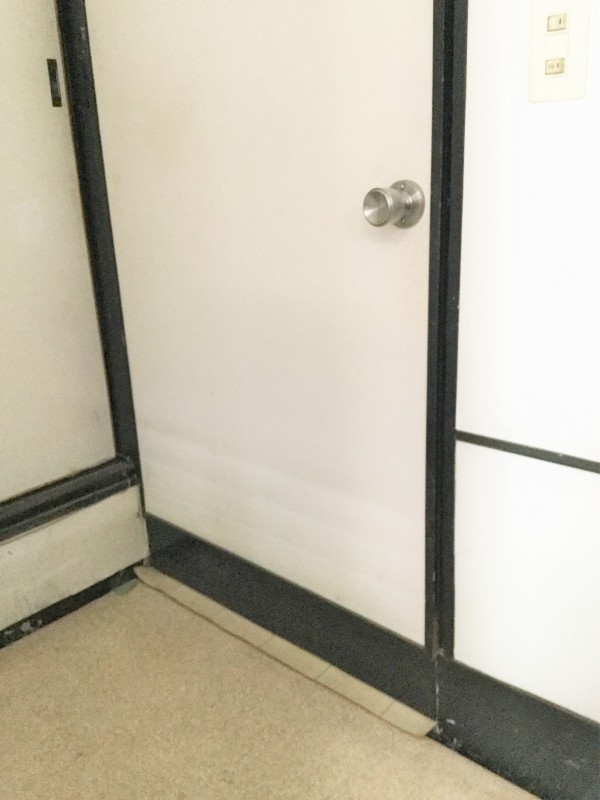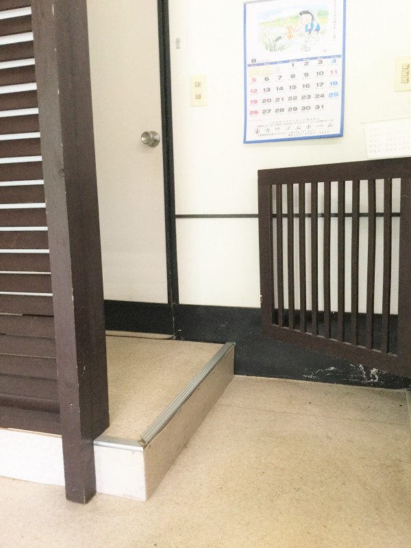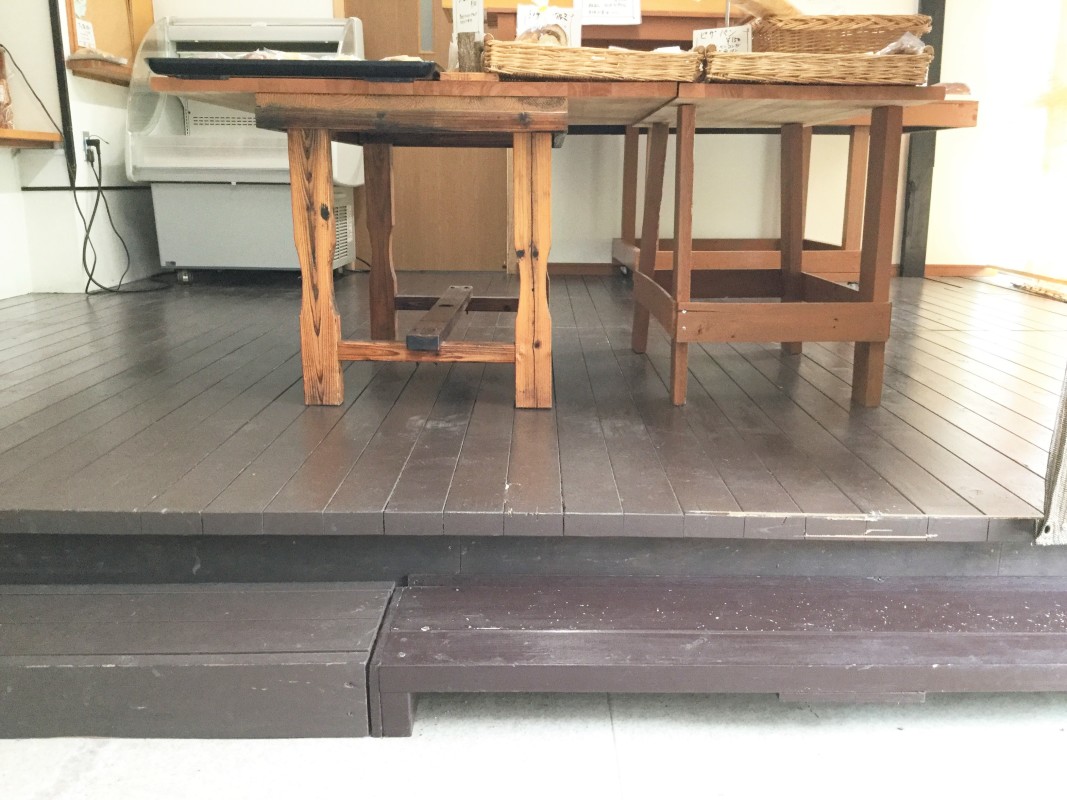 (飲食コーナー)10センチの段差2段、13センチほどの段差が1段、計3段あり