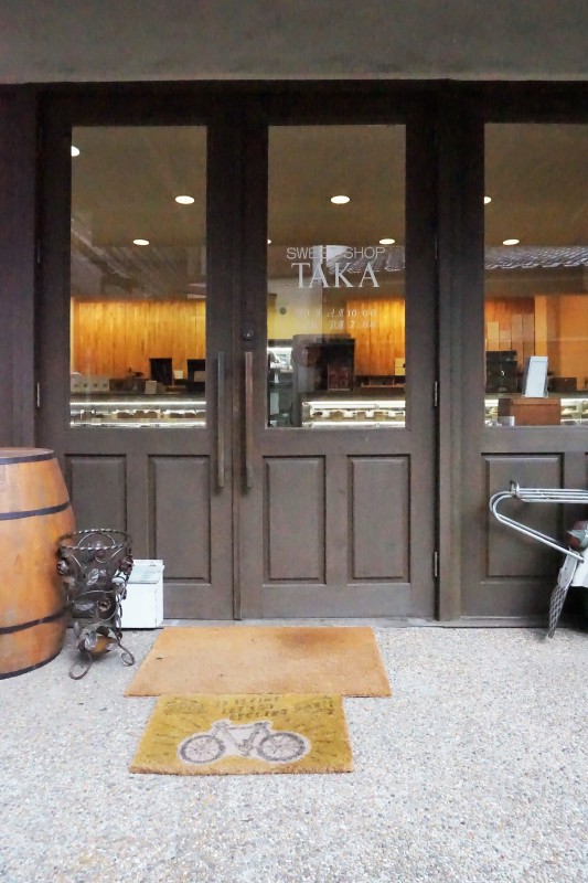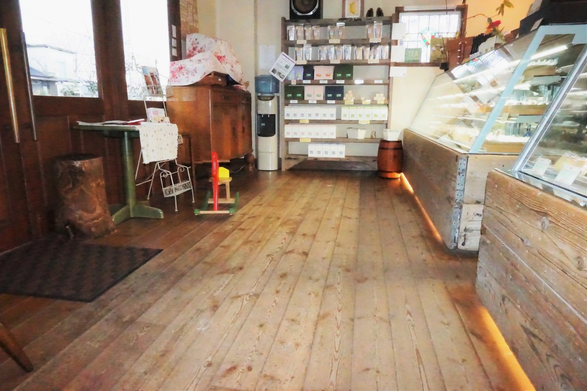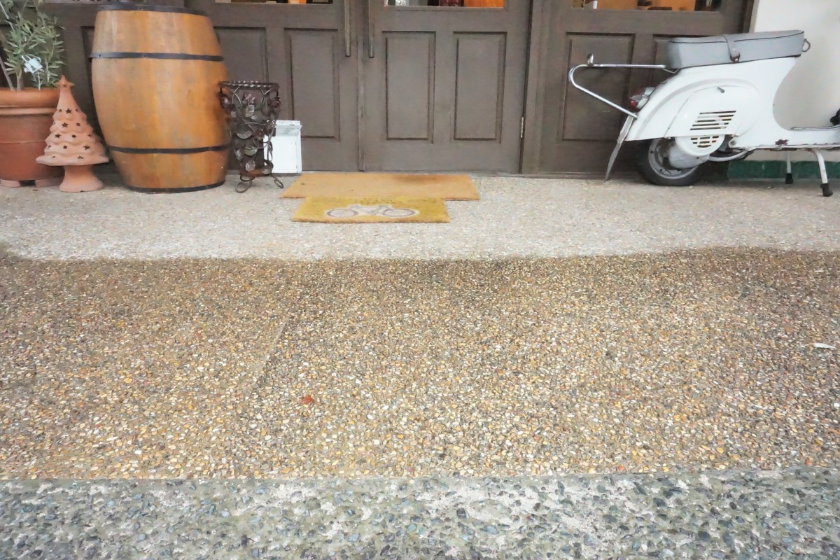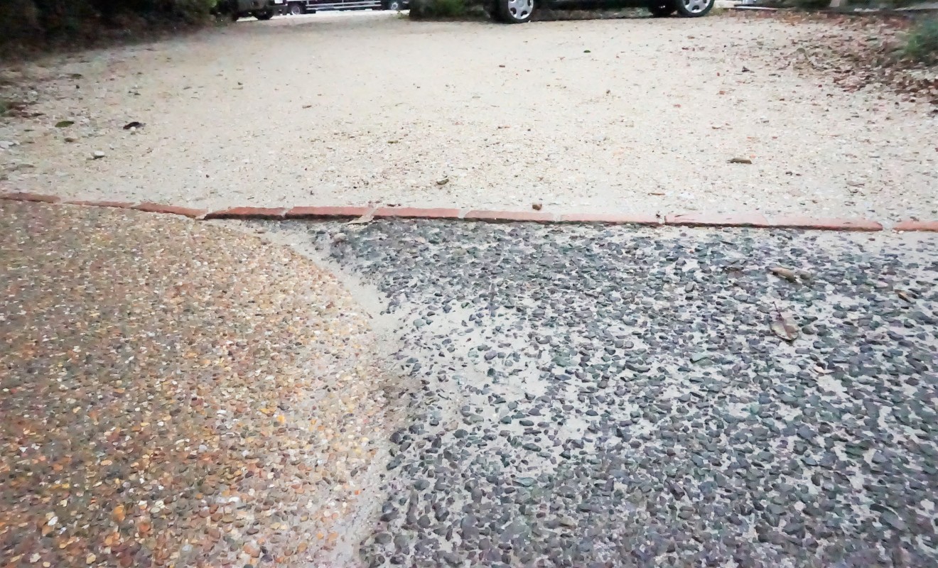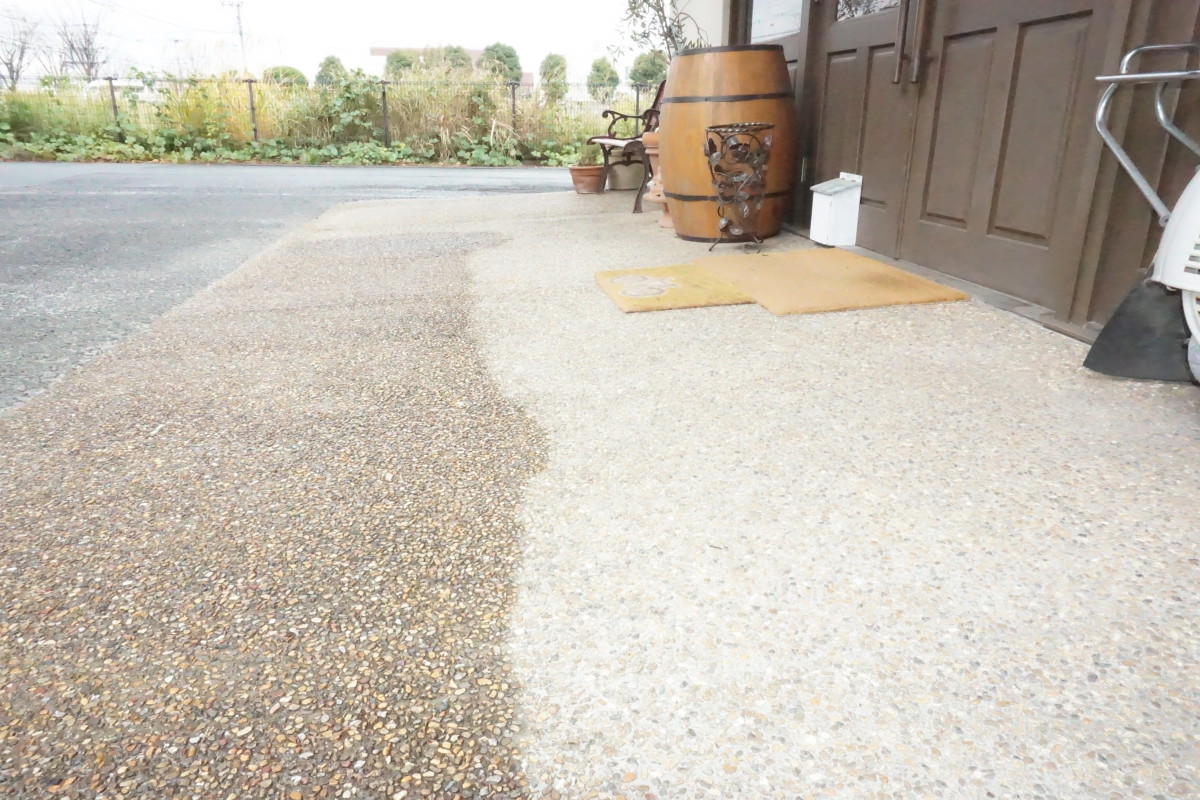 駐車場から店舗前までの敷地内通路にブロックの仕切りあり