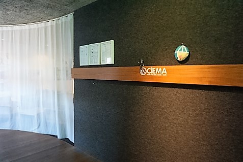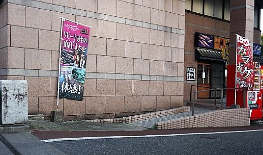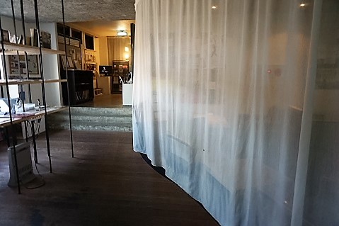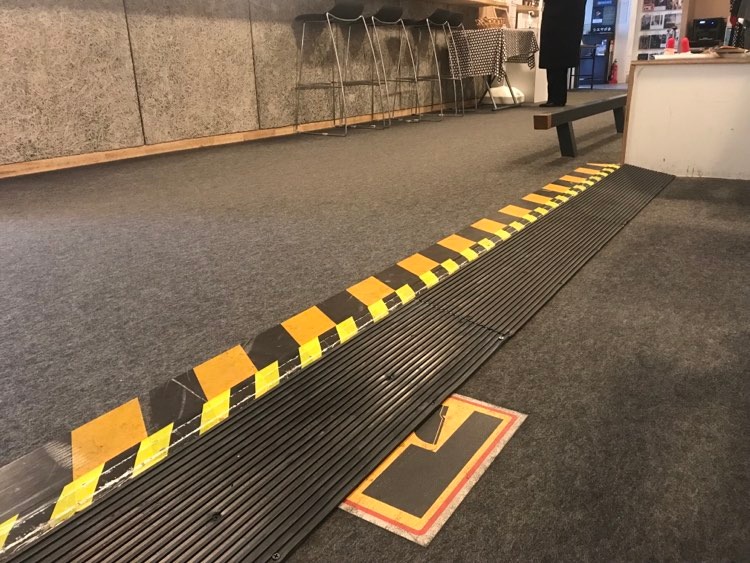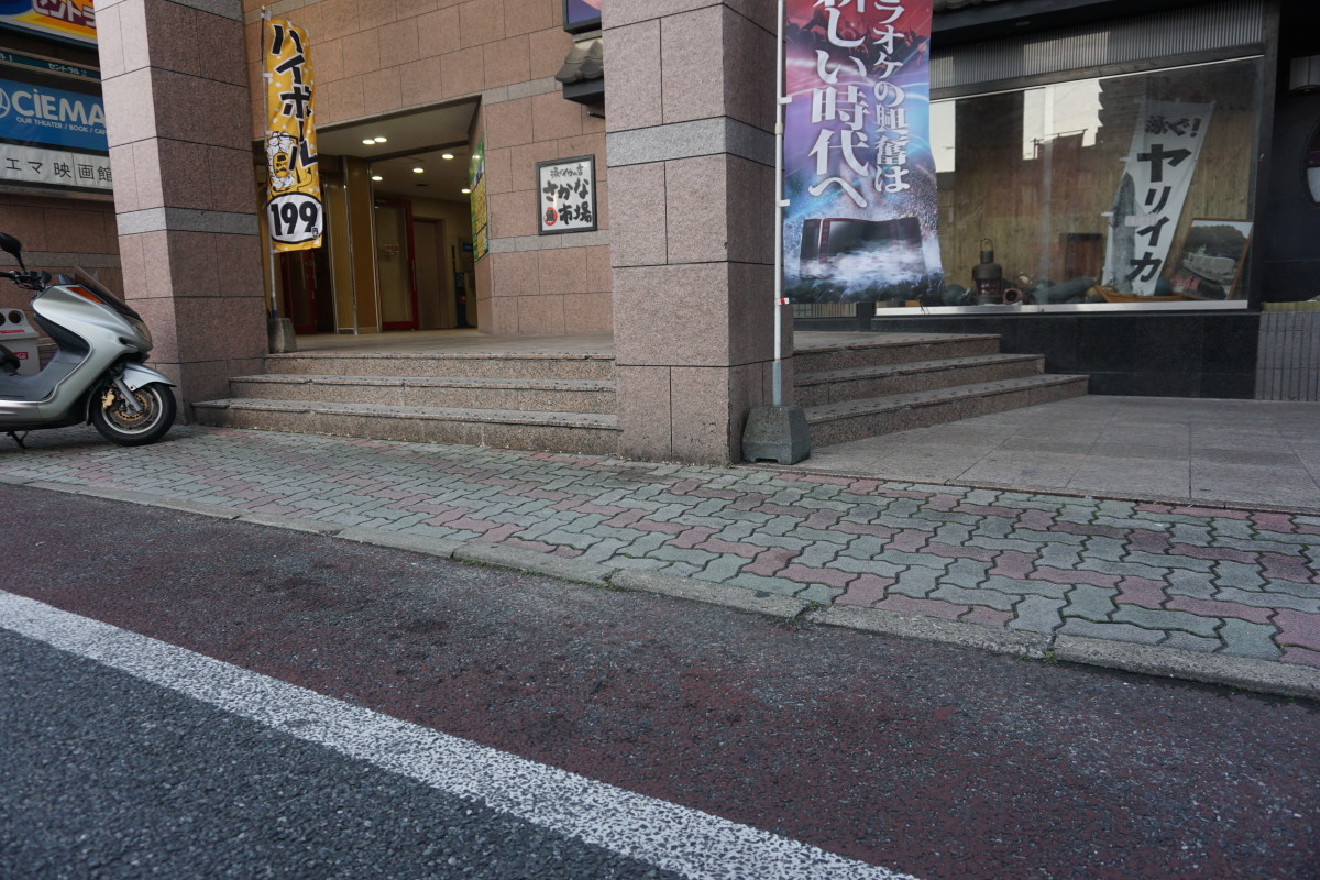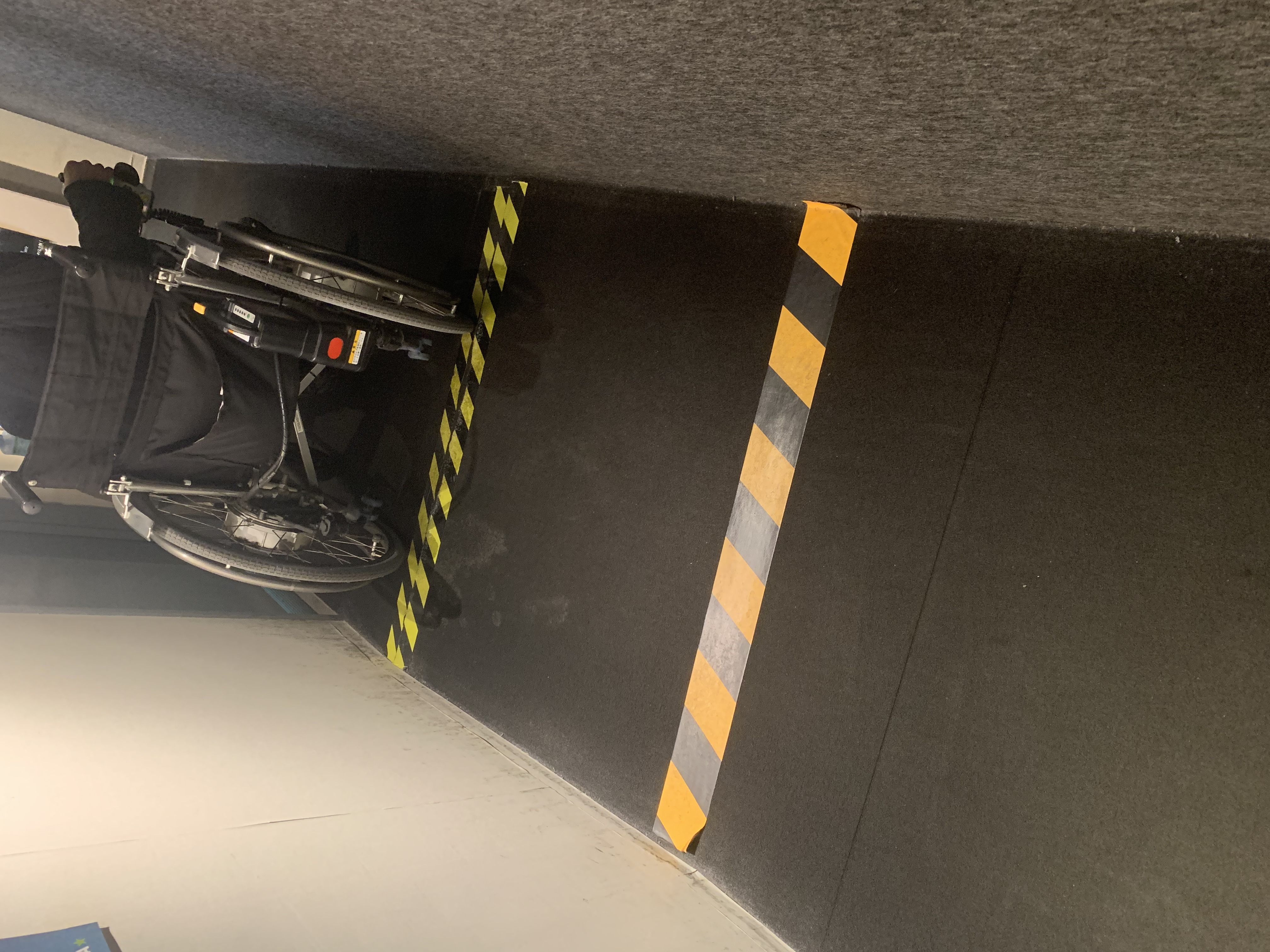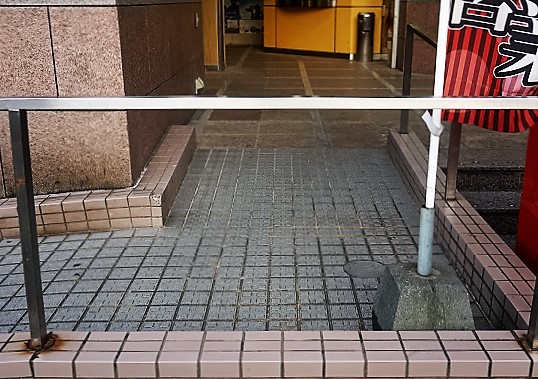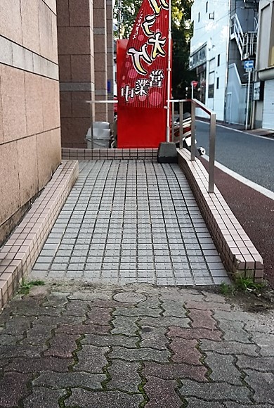 受付までの通路に段差があります。右側のカーテンをくぐってもらうとスロープがあります。