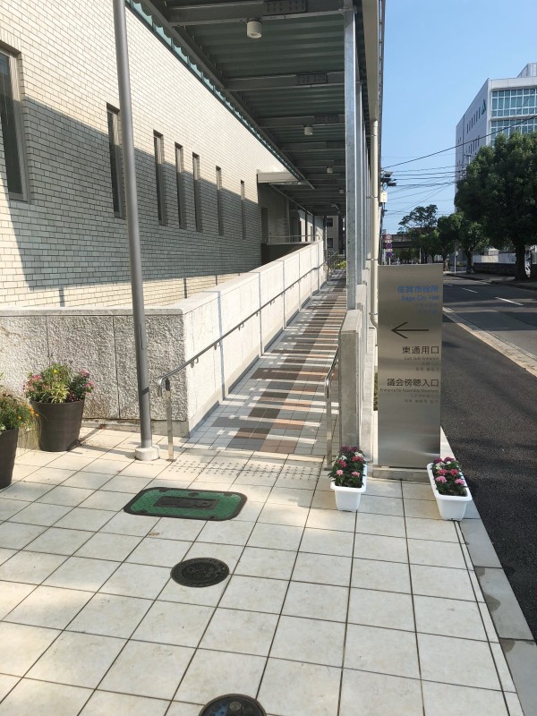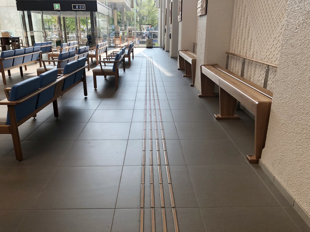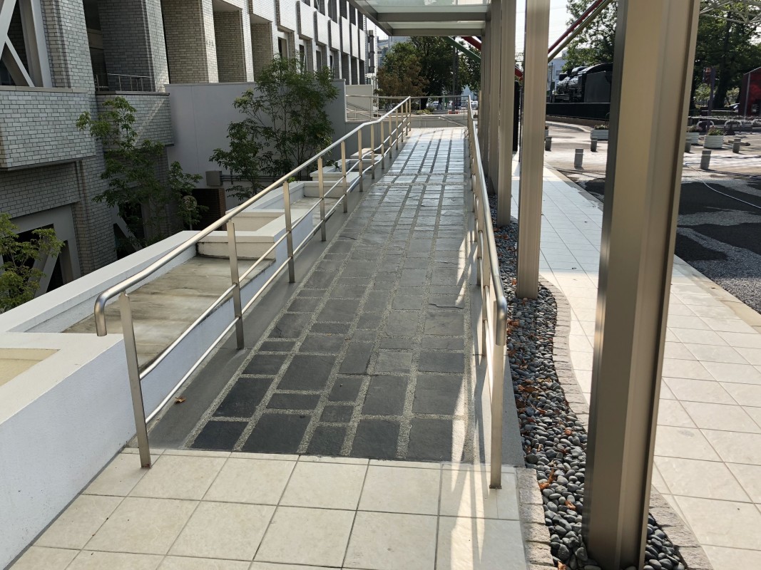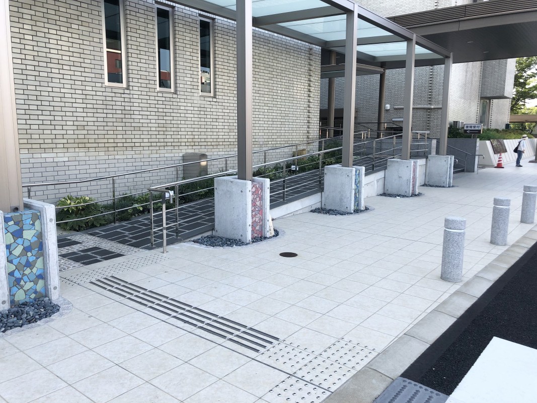 北、東、西それぞれの出入口につながる動線には視覚障害者誘導用ブロックとスロープが設置されています。