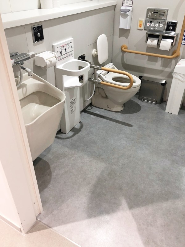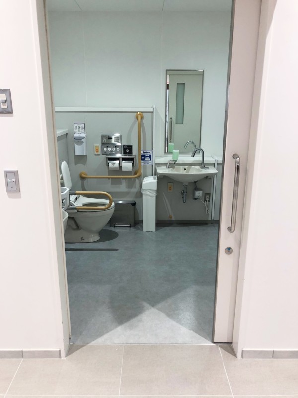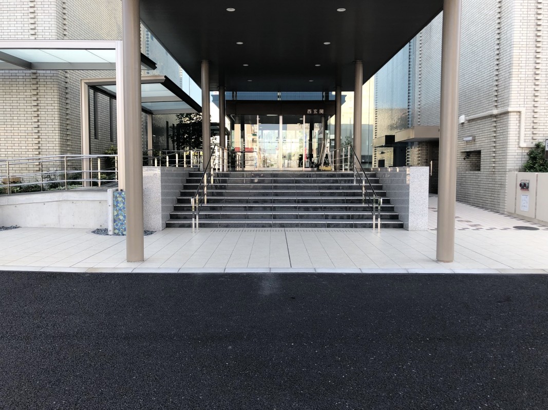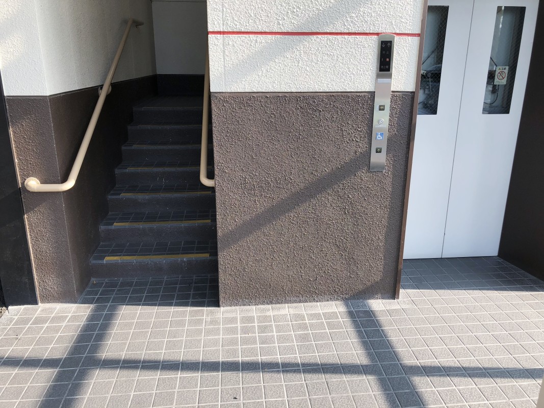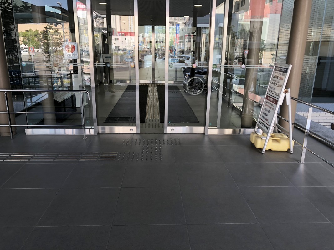 出入口はすべて自動ドア。出入口手前に階段とスロープあり。