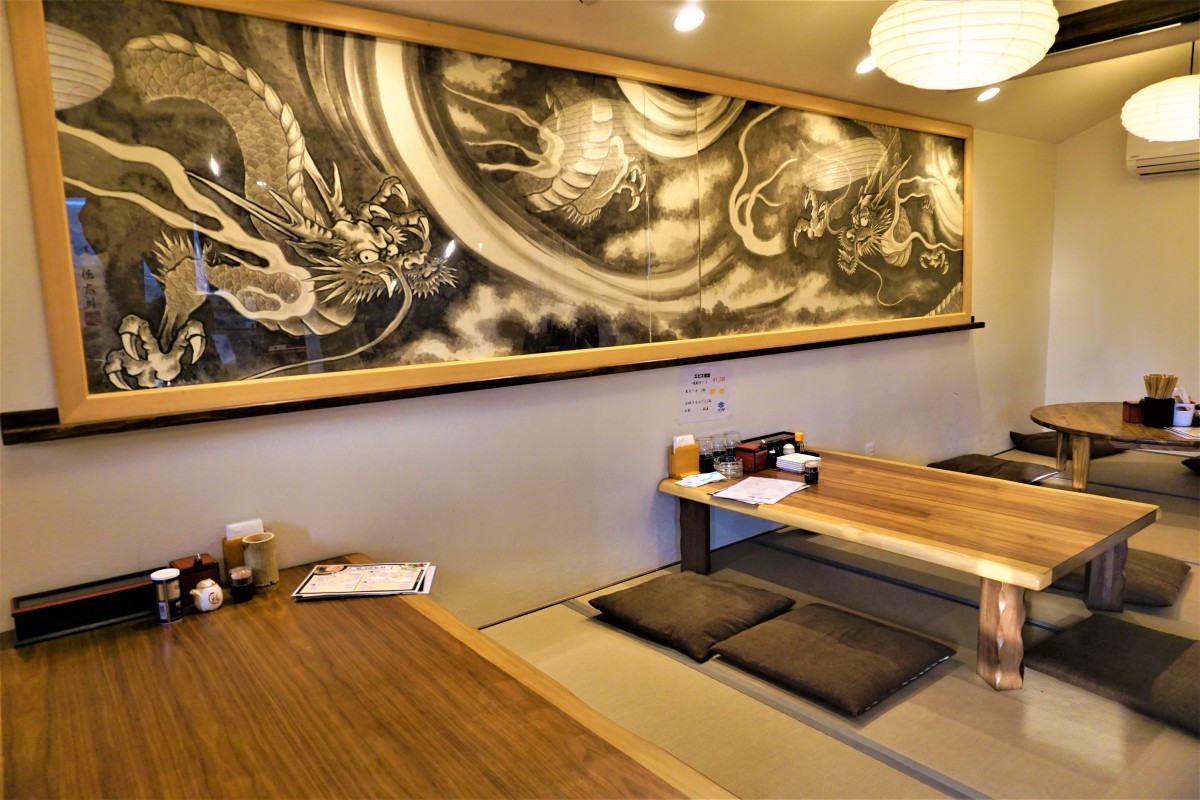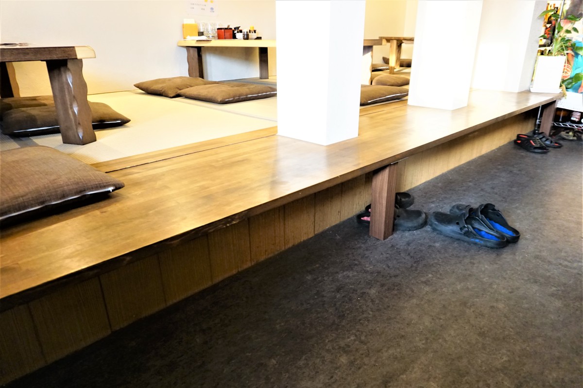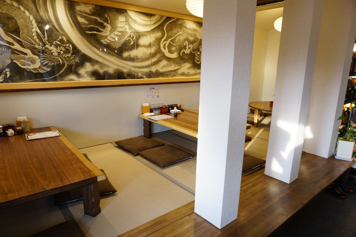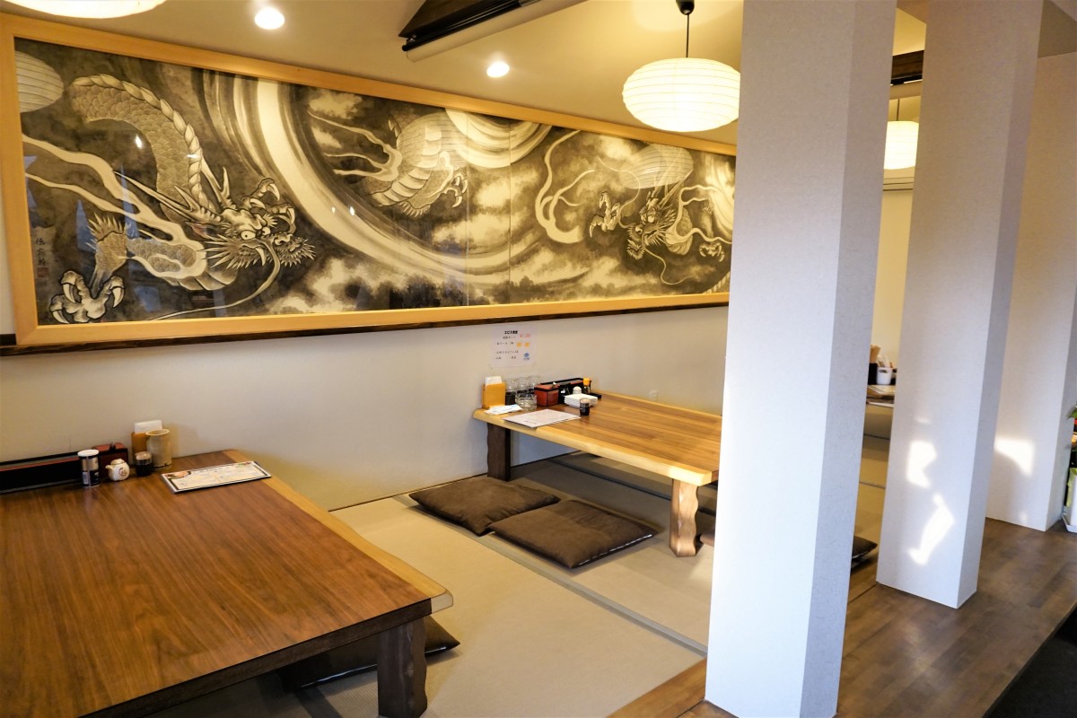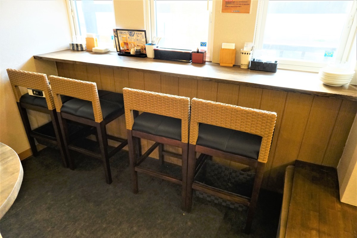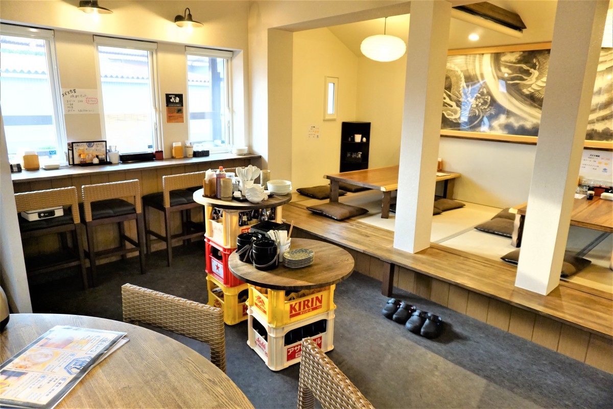 駐車場は佐賀銀行神埼支店方面へ80m程(歩いて1分)の地区共用の広い駐車場がありますのでそちらを利用してください。地区共用駐車場には身障者等用駐車場2台、共用トイレには車いす用トイレもあります。店舗には一般の洋式トイレのみ、入り口から段差がありバリアフリーではありません。お座敷があるのでお子さま連れもゆっくりとお過ごしいただく事ができます。