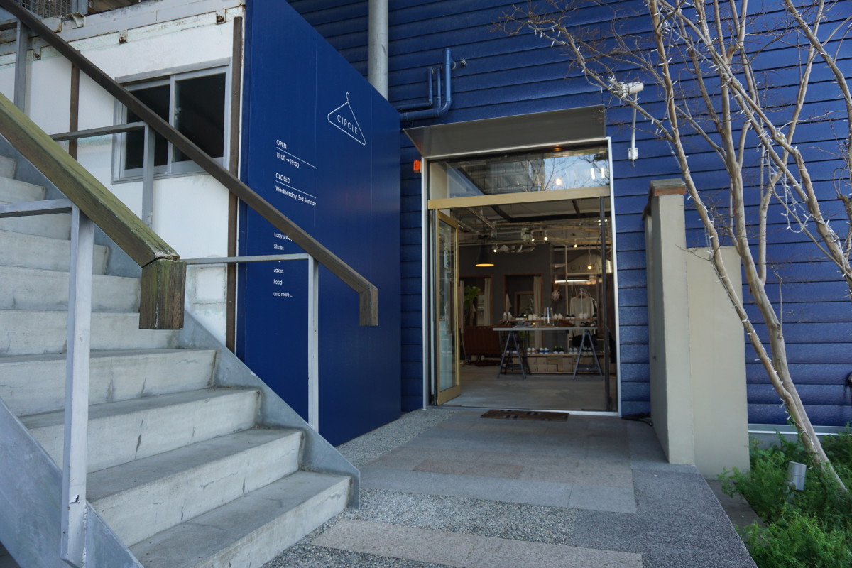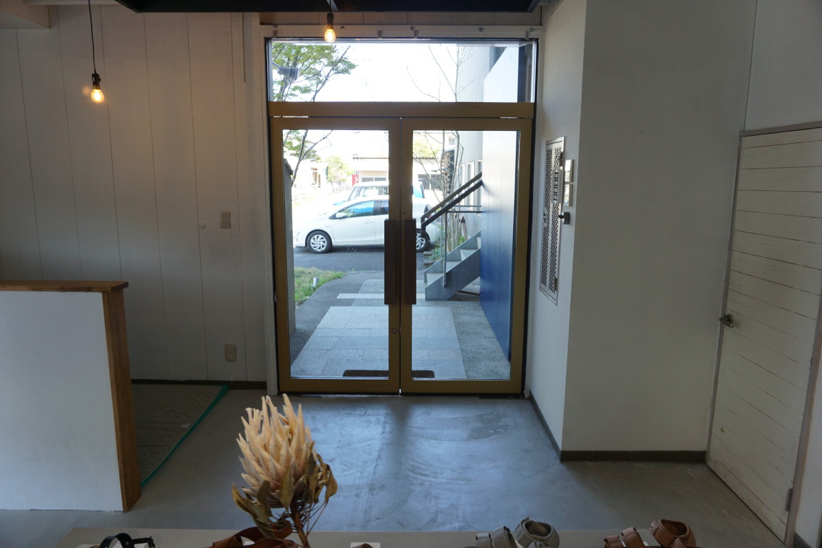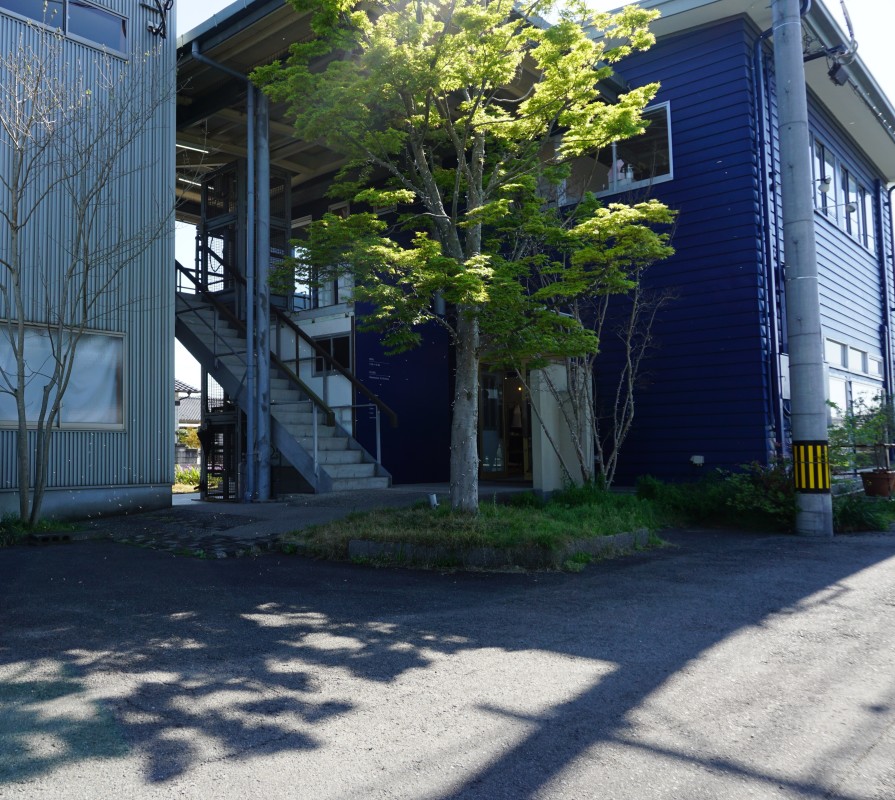 神園大橋通りから小道に入ったところにある大きな窓と青い建物が特徴的なお店です。