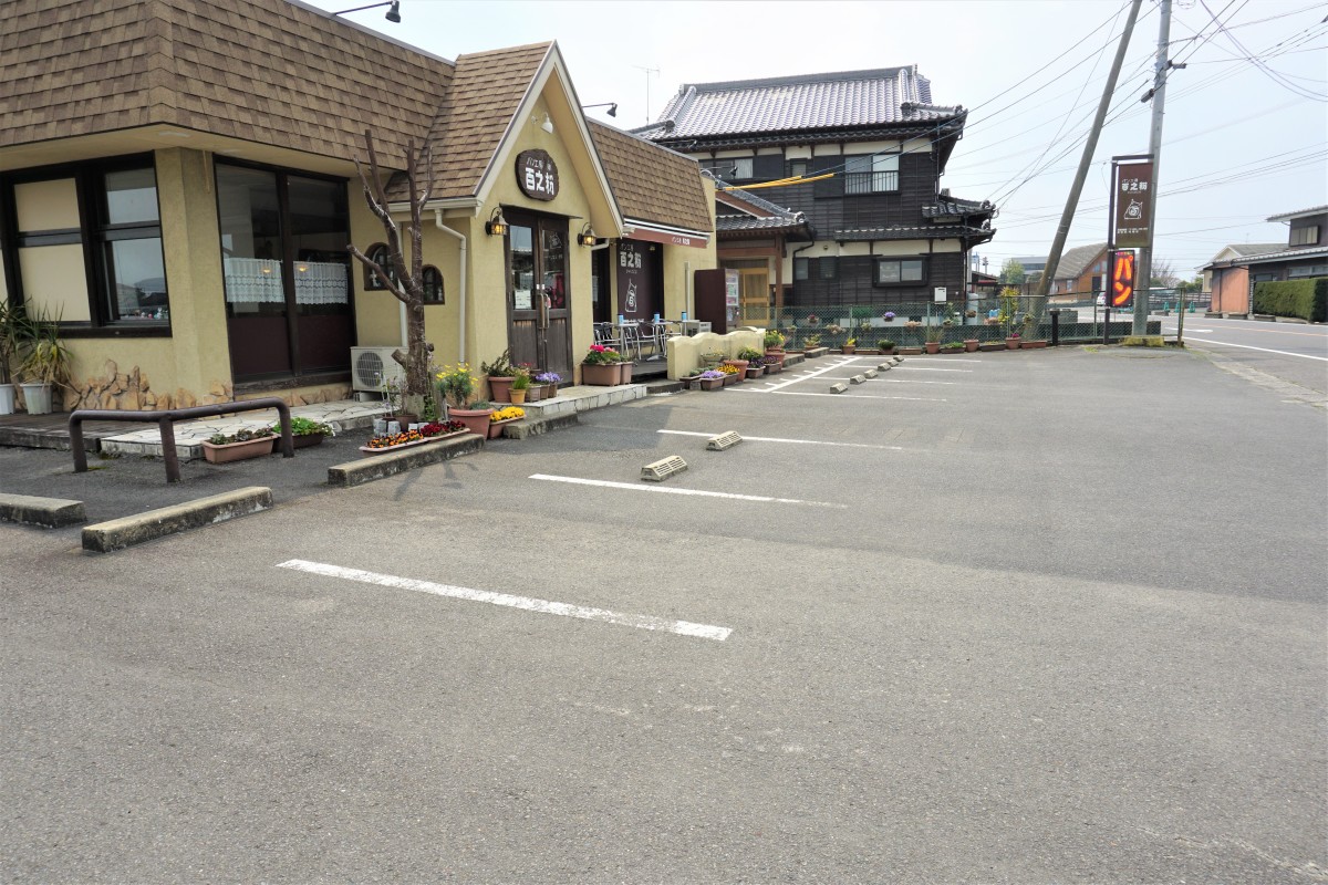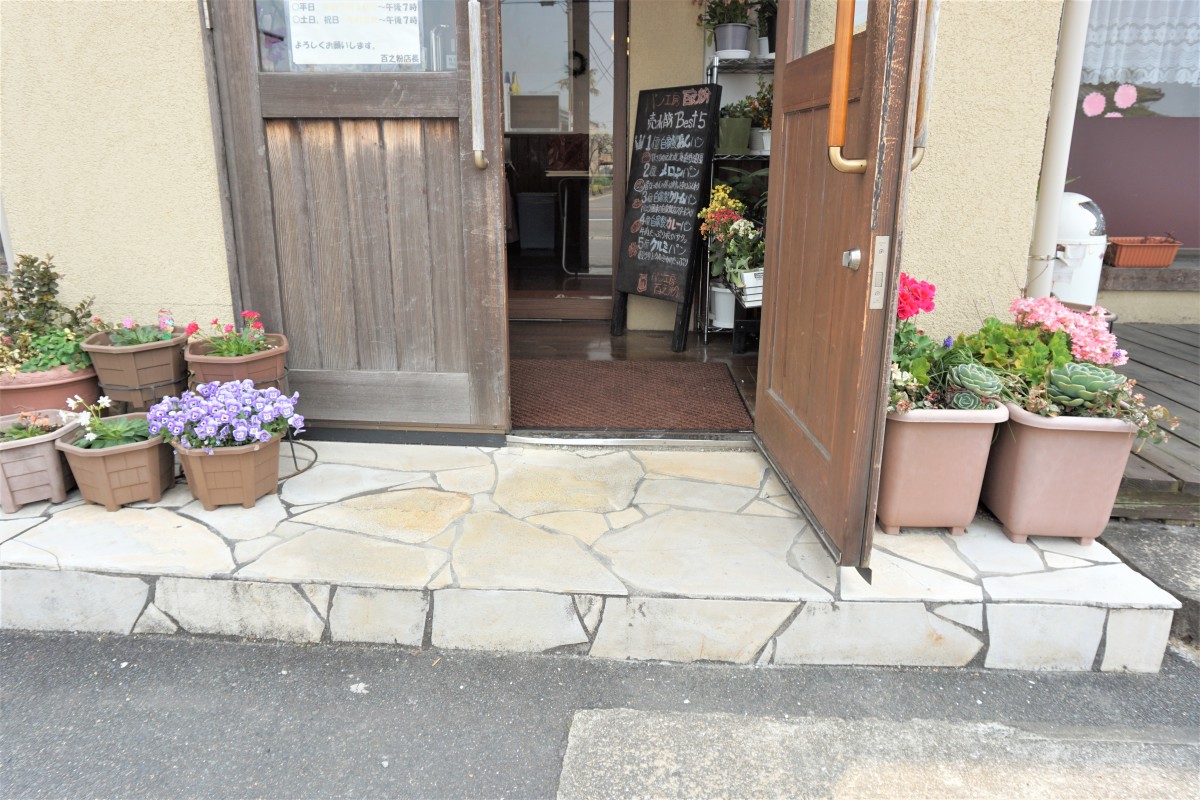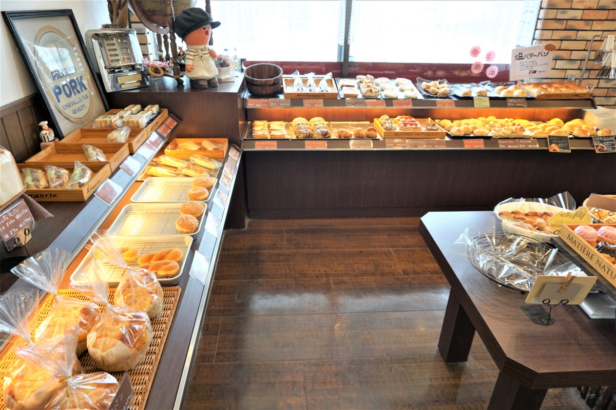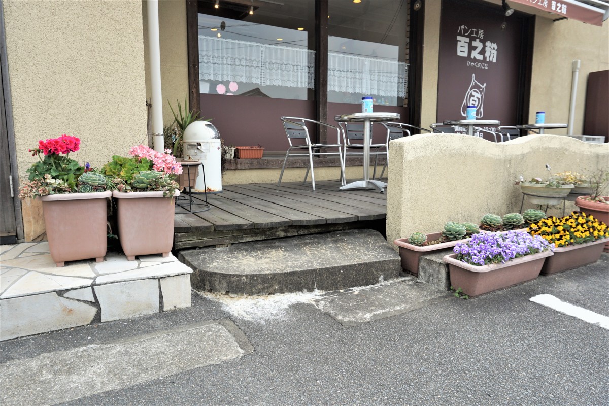 身障者等用駐車場はございませんが、駐車場の敷地は広いです。テラスにて購入したパンをお楽しみいただけます。入り口とテラスの前に段差がございます。