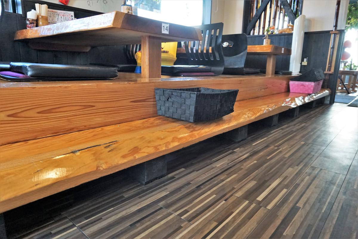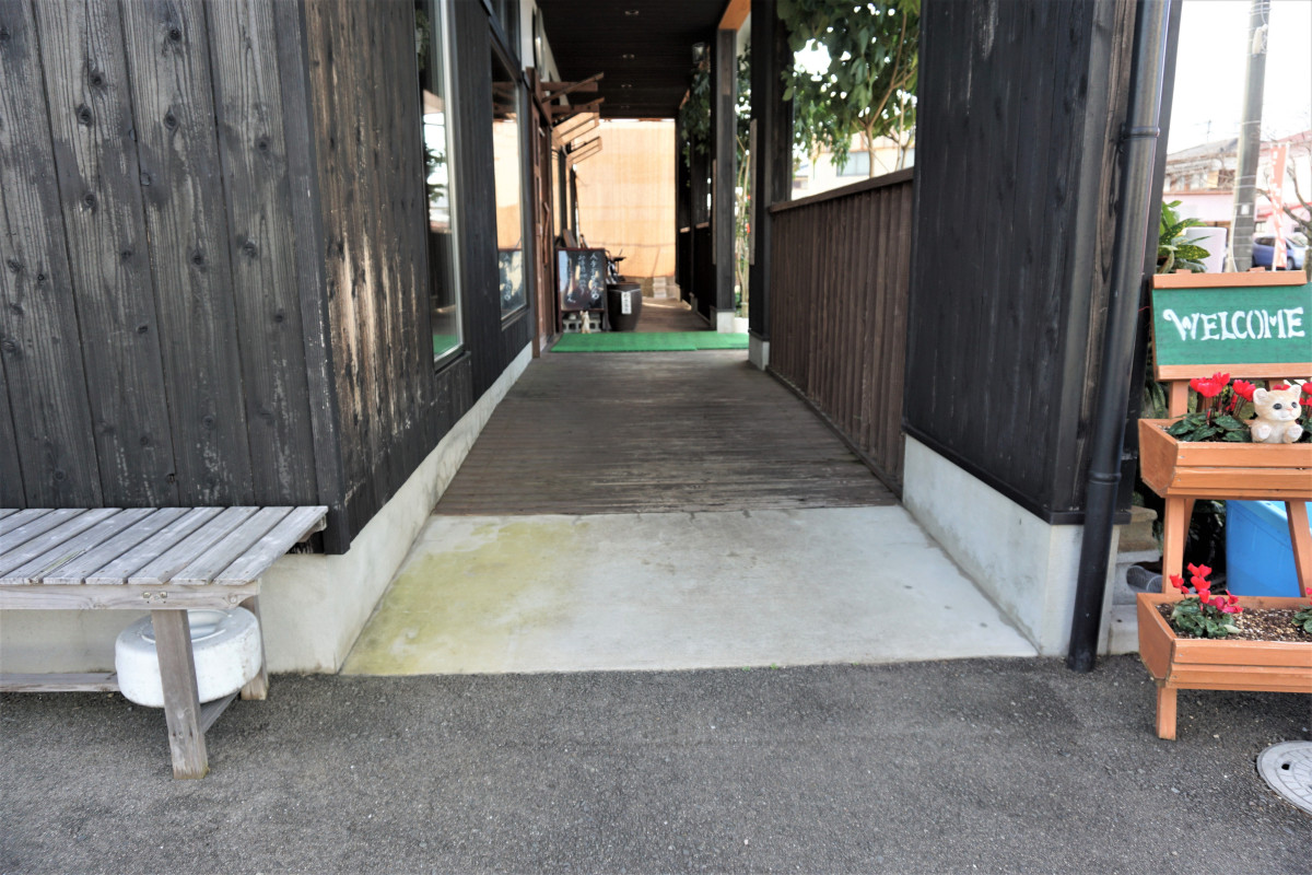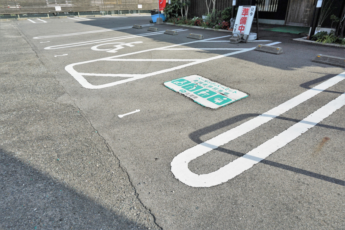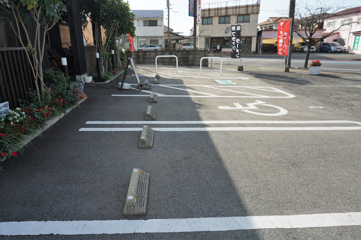 お子連れやご高齢の方、車いすの方など、車の乗降がしやすいように駐車場を広く取っています。パーキングパーミット、身障者等用駐車場も1台ずつ店舗入り口前にございます。お座敷あり、テーブル席あり、段差なく店内へスムーズに入店できます。