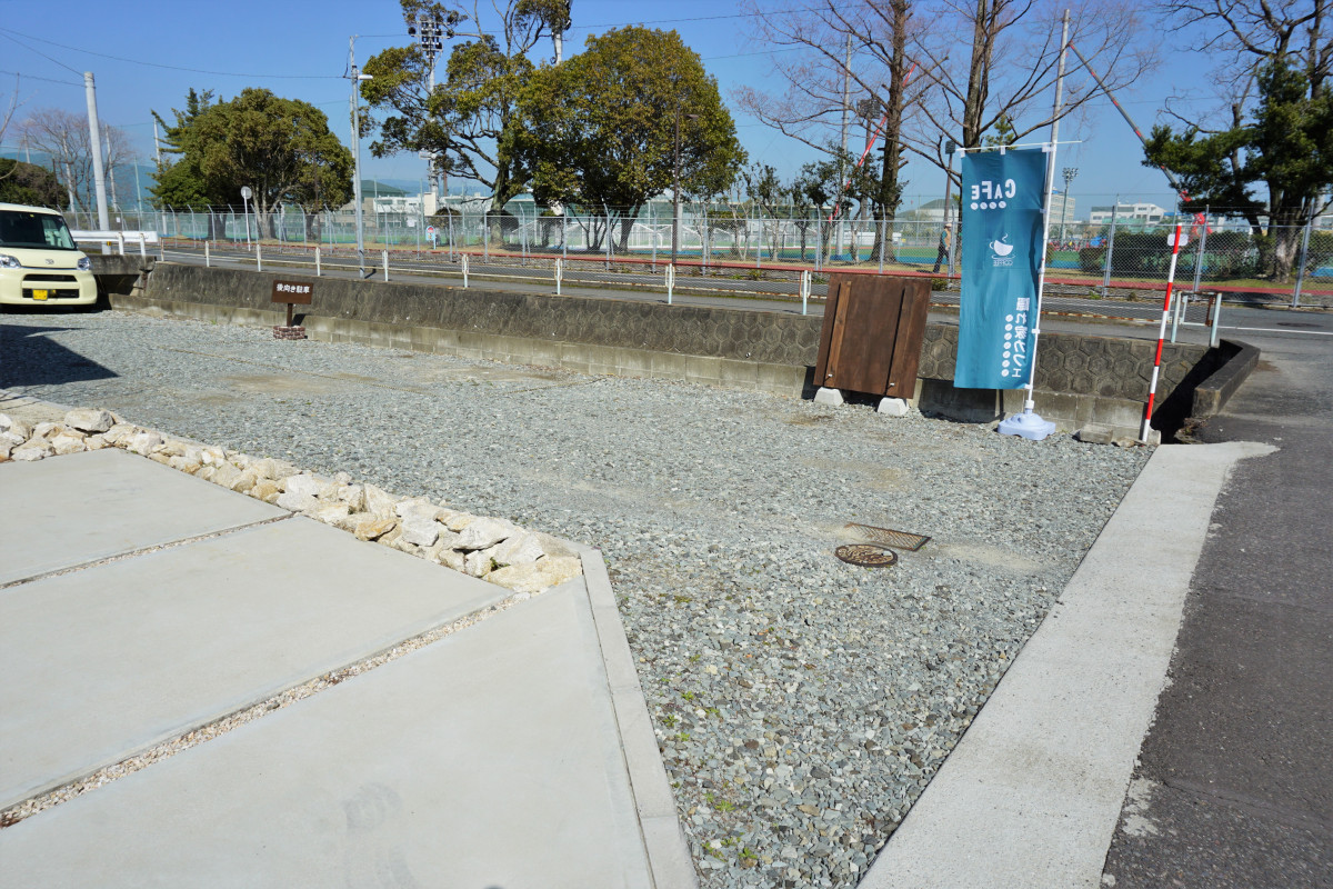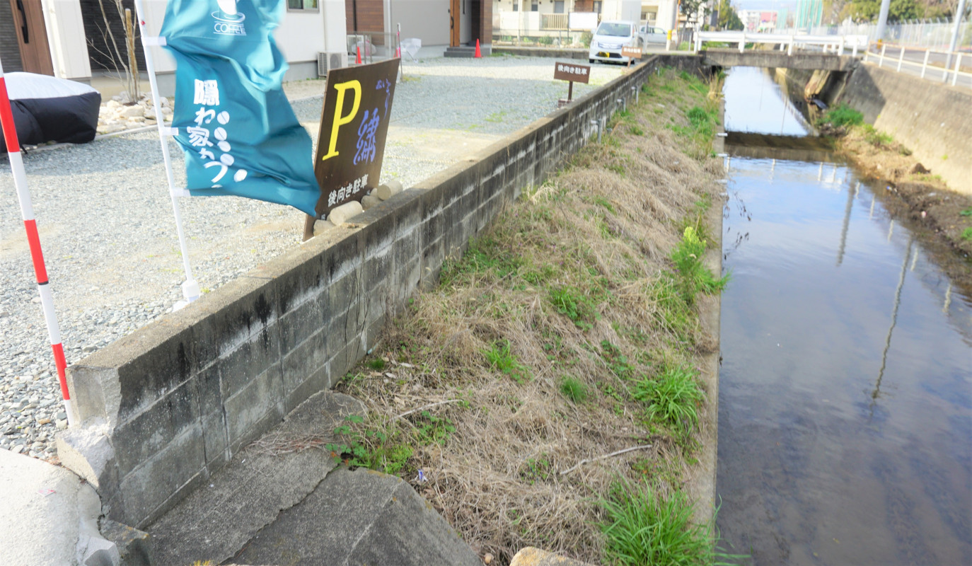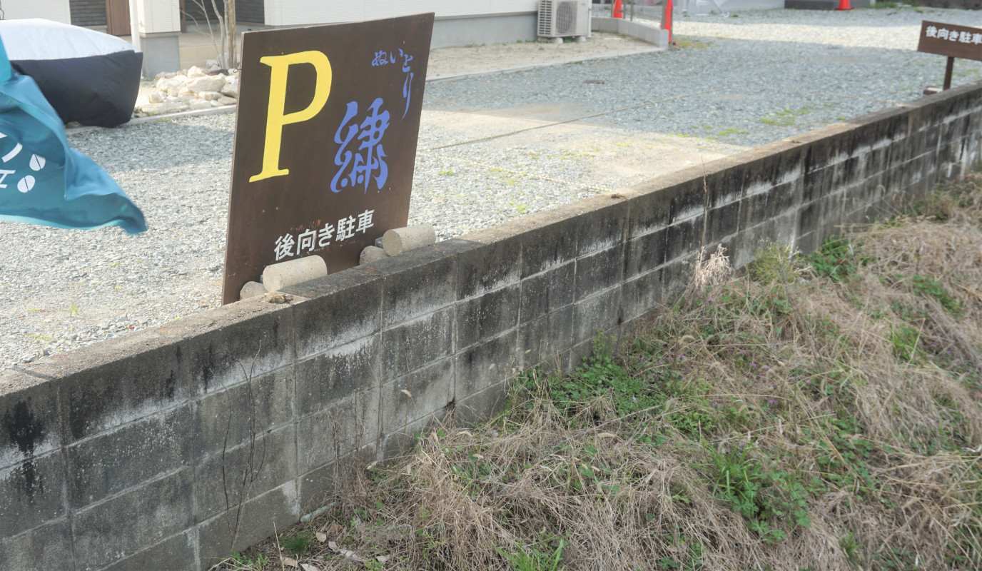駐車場は住宅地の入り口に用意していますが、舗装なし、縦列駐車となっております。近隣の住宅の方の通路を空けて、看板とロープ枠に従って駐車してください。