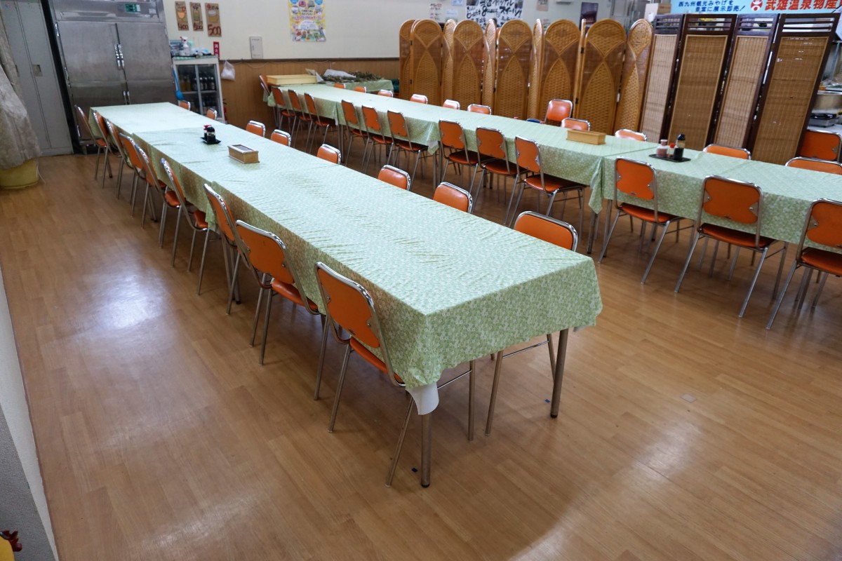 食事処は1階、2階にあります。2階へは階段のみ。最大350人収容可能。