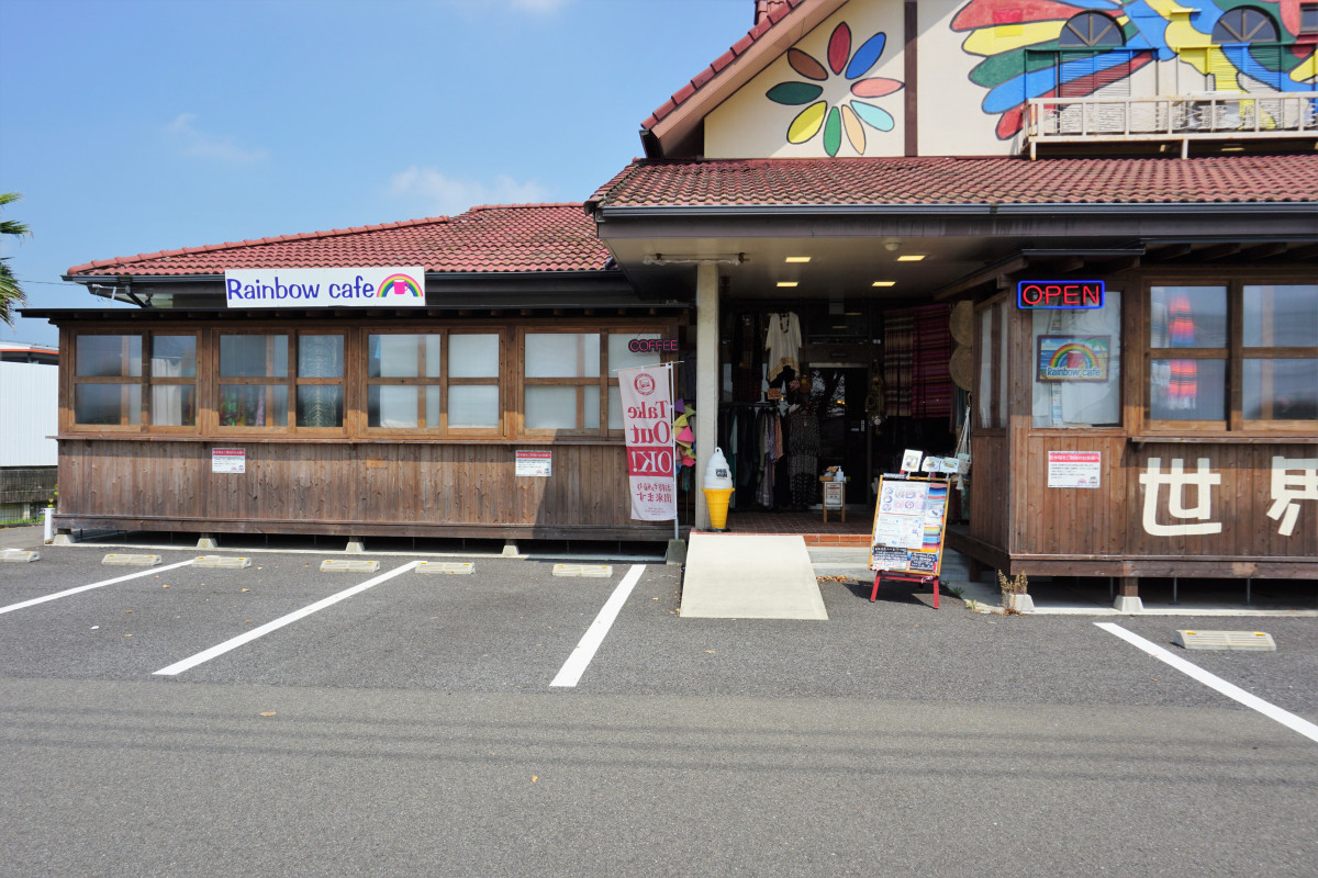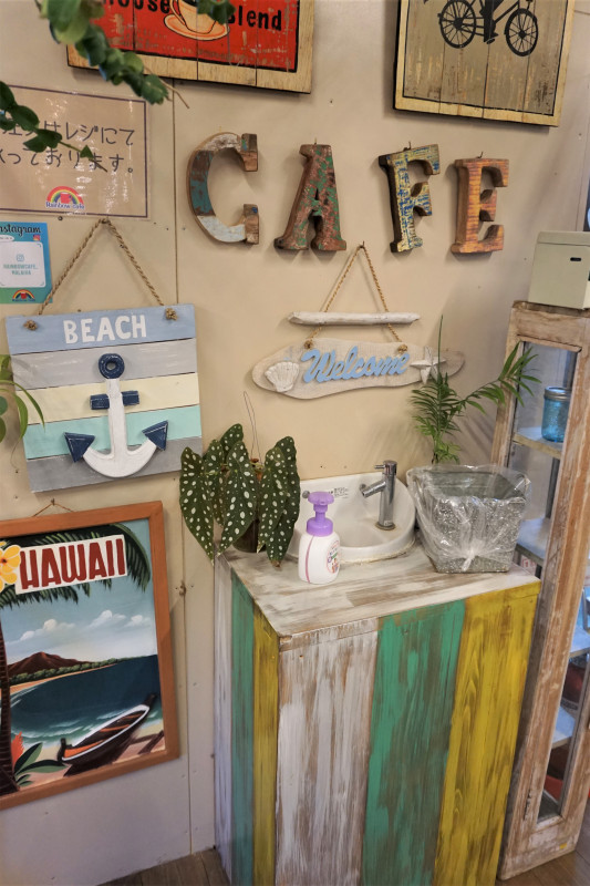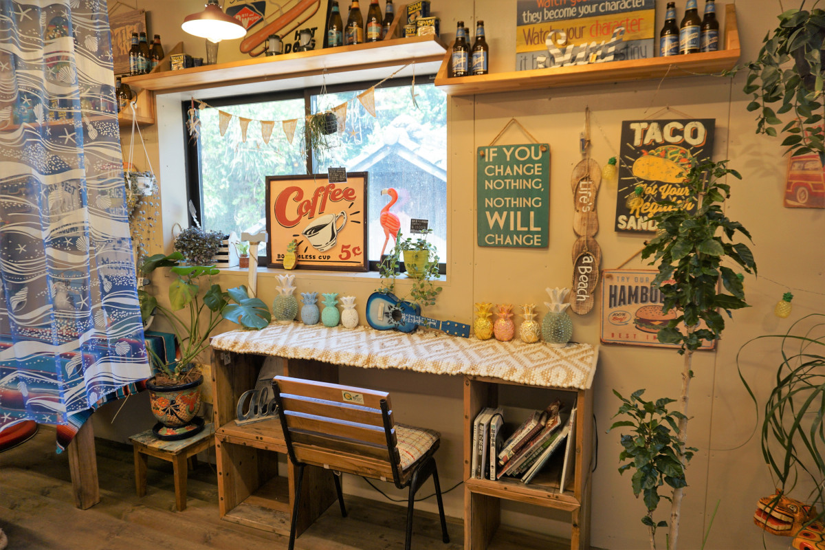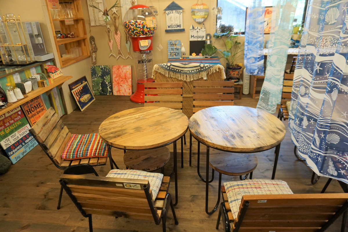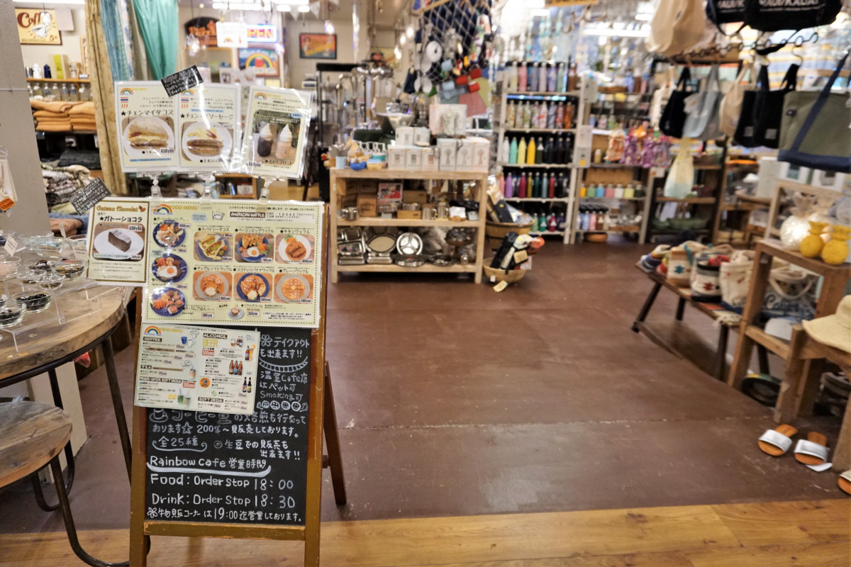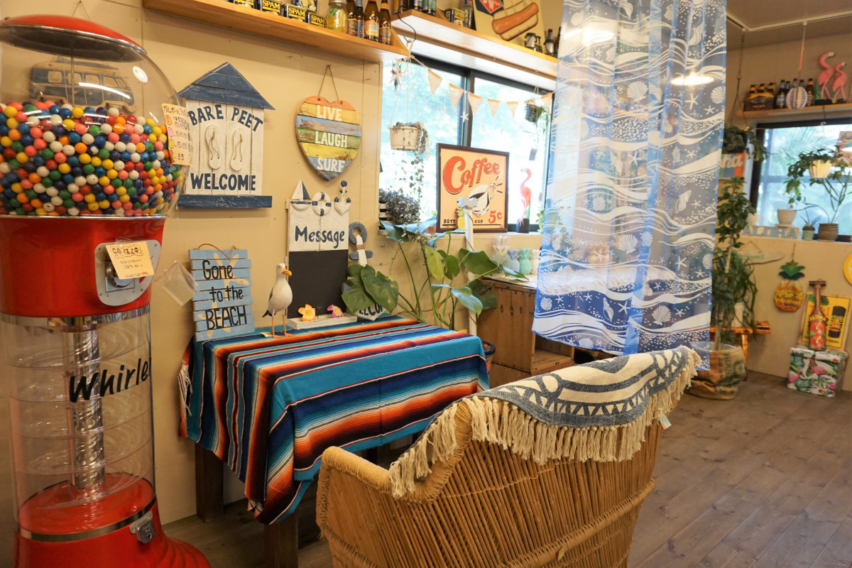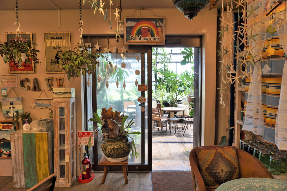 エスニックな雰囲気の雑貨店の中に、ハワイアンテイストなカフェ「Rainbow cafe」が併設されています。まるで海沿いのカフェでランチやコーヒータイム気分で、タコスや焼き加減もお客様の好みで1枚1枚丁寧に焼くワッフル、ガーリックシュリンプなどのお食事やデザートを食べることができます。自家焙煎機で焙煎された豆の購入も可能!!テイクアウトも行っていますので、ご自宅でもお楽しみください。