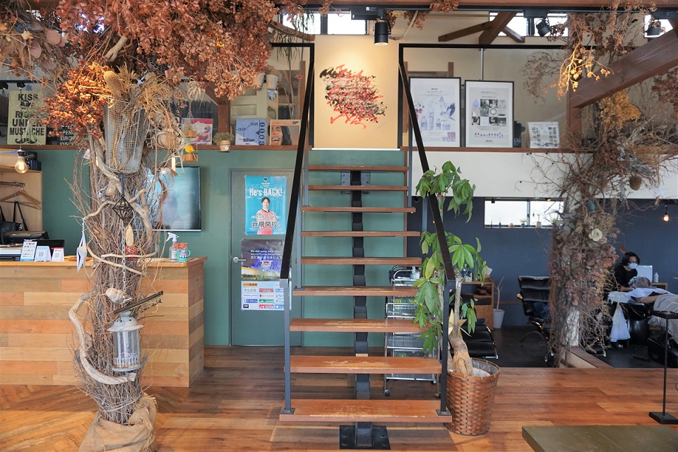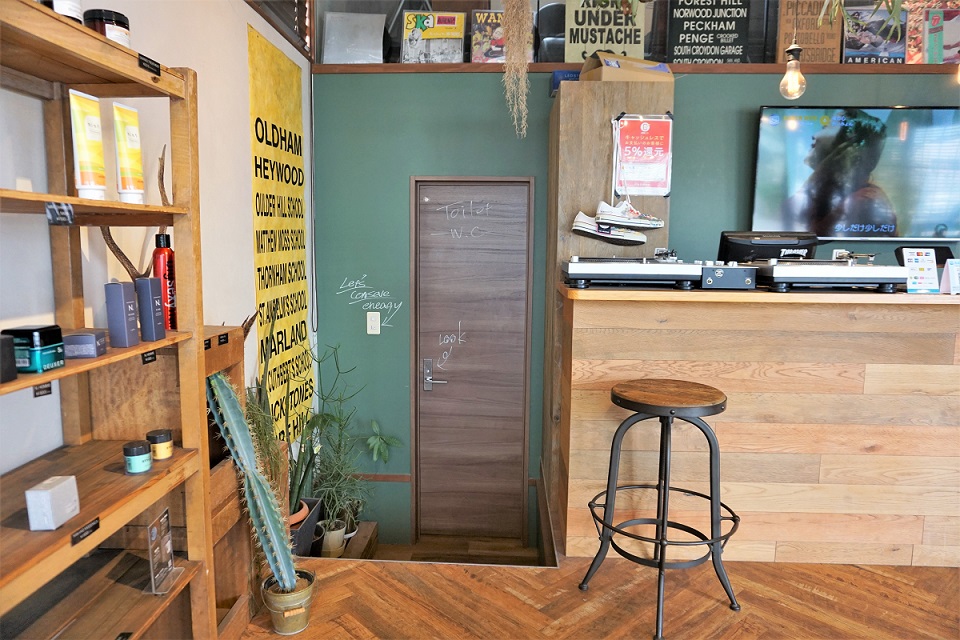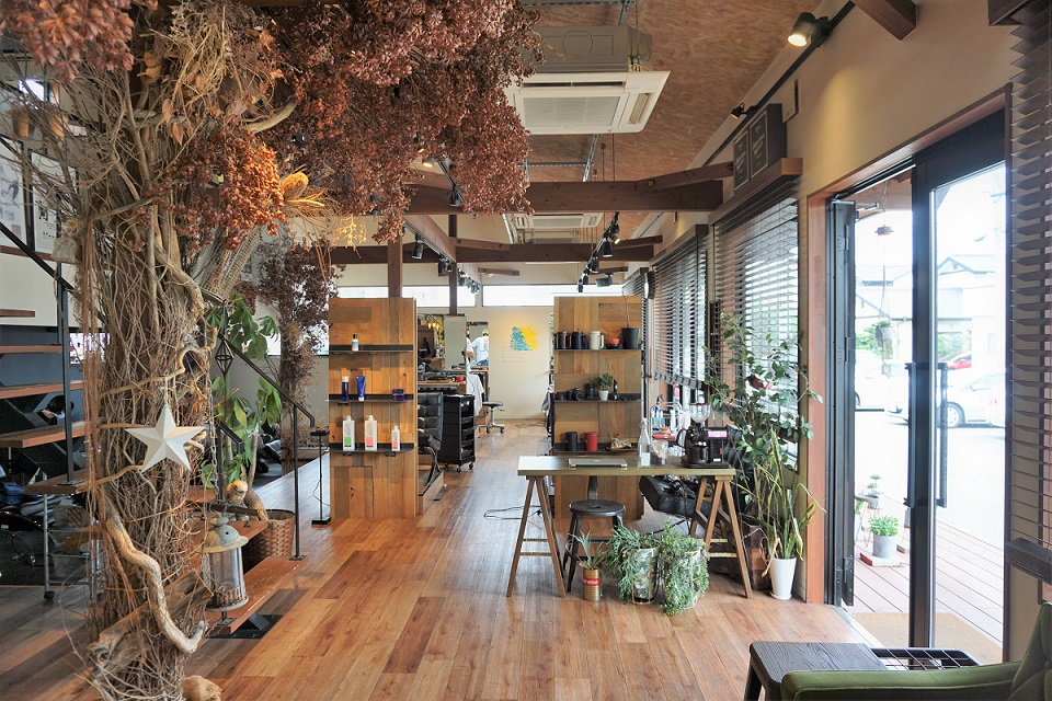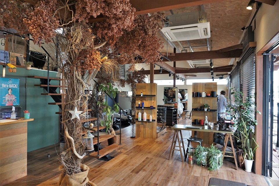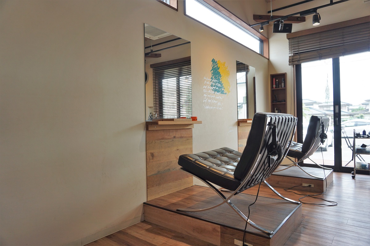 店舗入り口の前にはウッドデッキがあり入店までに3段の段差があります。屋内は解放感たっぷりの空間が広がります。カット面やシャンプーコーナーへの通路、トイレに段差があります。必要な方はできる限りお手伝いいたしますので、お声掛けください。