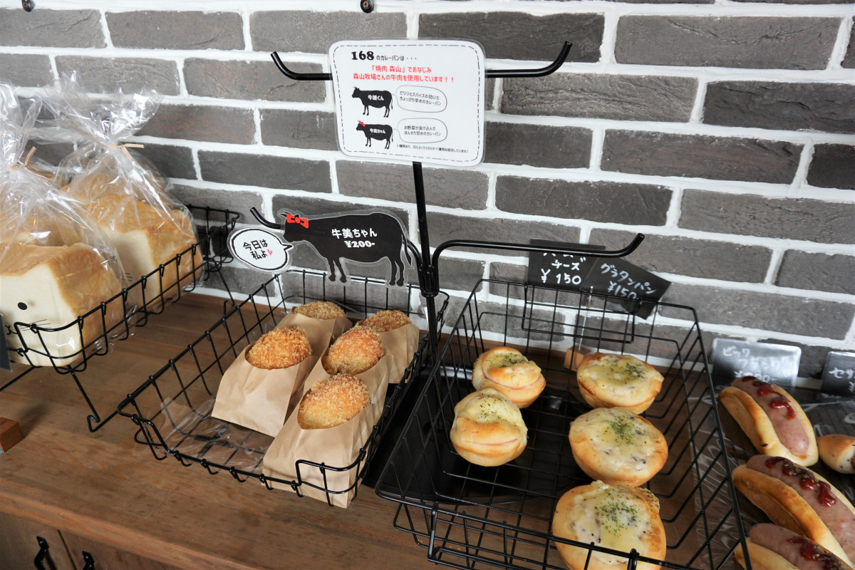 小さな店舗ですが、1つ1つ丁寧に「ママと子どもたちが喜んでくれるパンであること」を大事に、メニューを考え、お出ししています。見た目や味だけでなく、身体も喜ぶようにイーストフードなどの添加物を極力使っていません。いつもの朝食も168特性のねこ型食パン「にゃーにゃーぱん」で、ちょっと楽しい朝食にしませんか?森山牧場の牛肉を使ったカレーパンもスパイスが効いた「牛雄くん」とお野菜の甘みを感じる「牛美ちゃん」の2種類あり、お好みでお楽しみください!