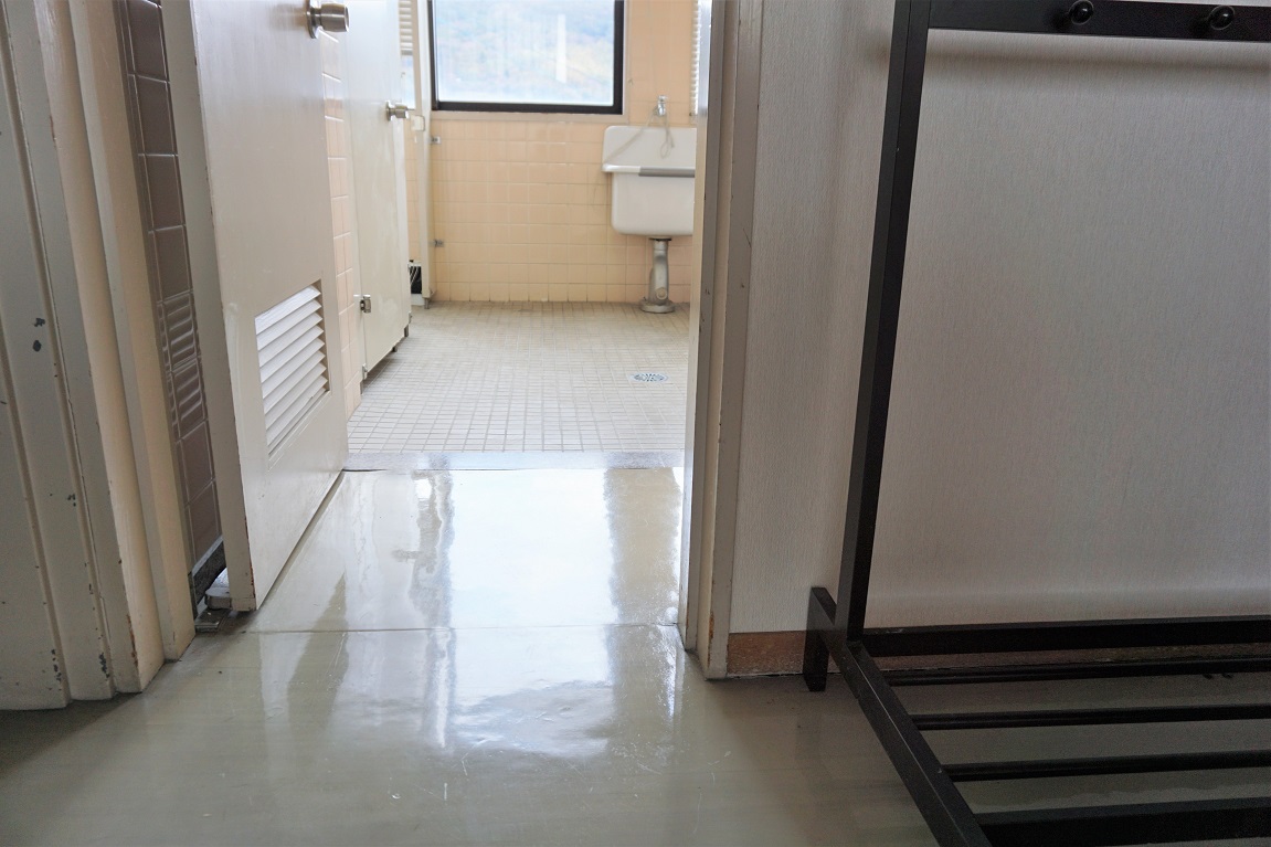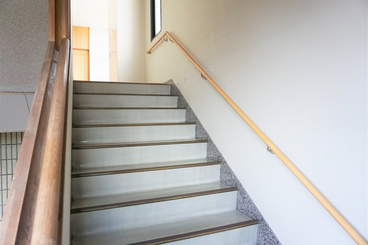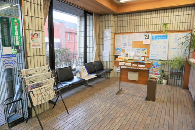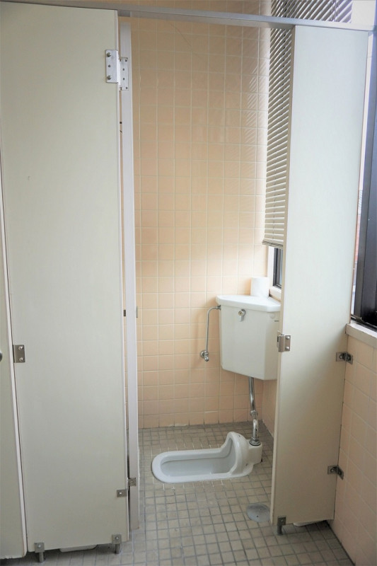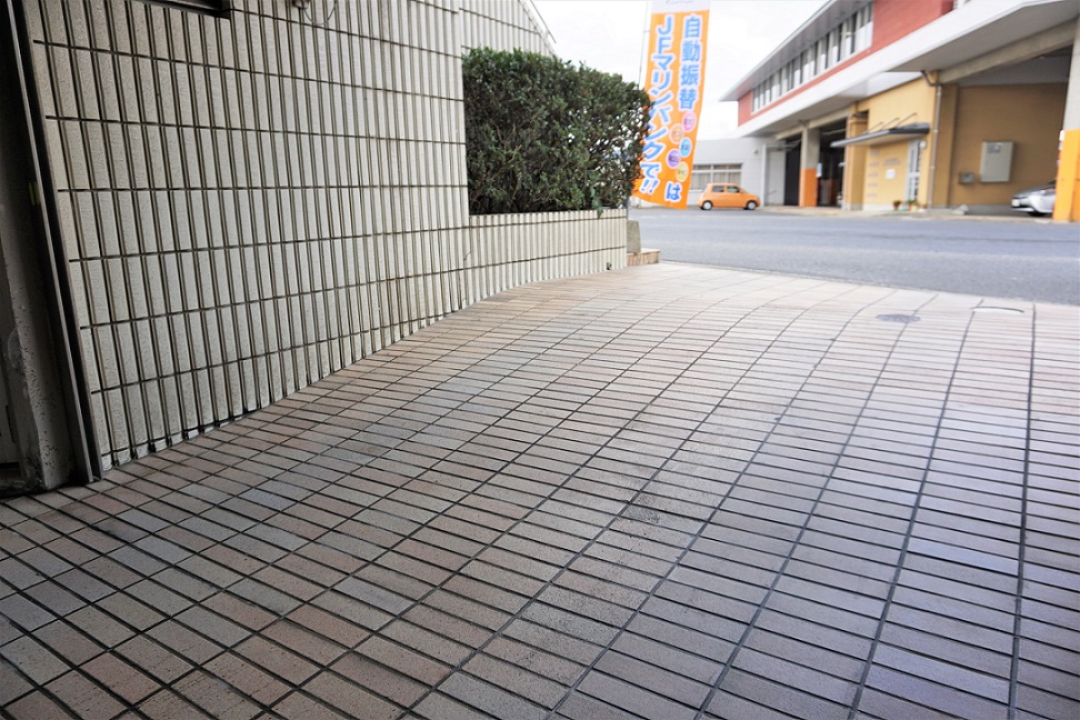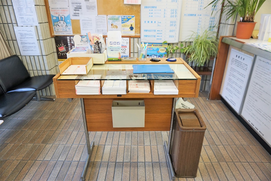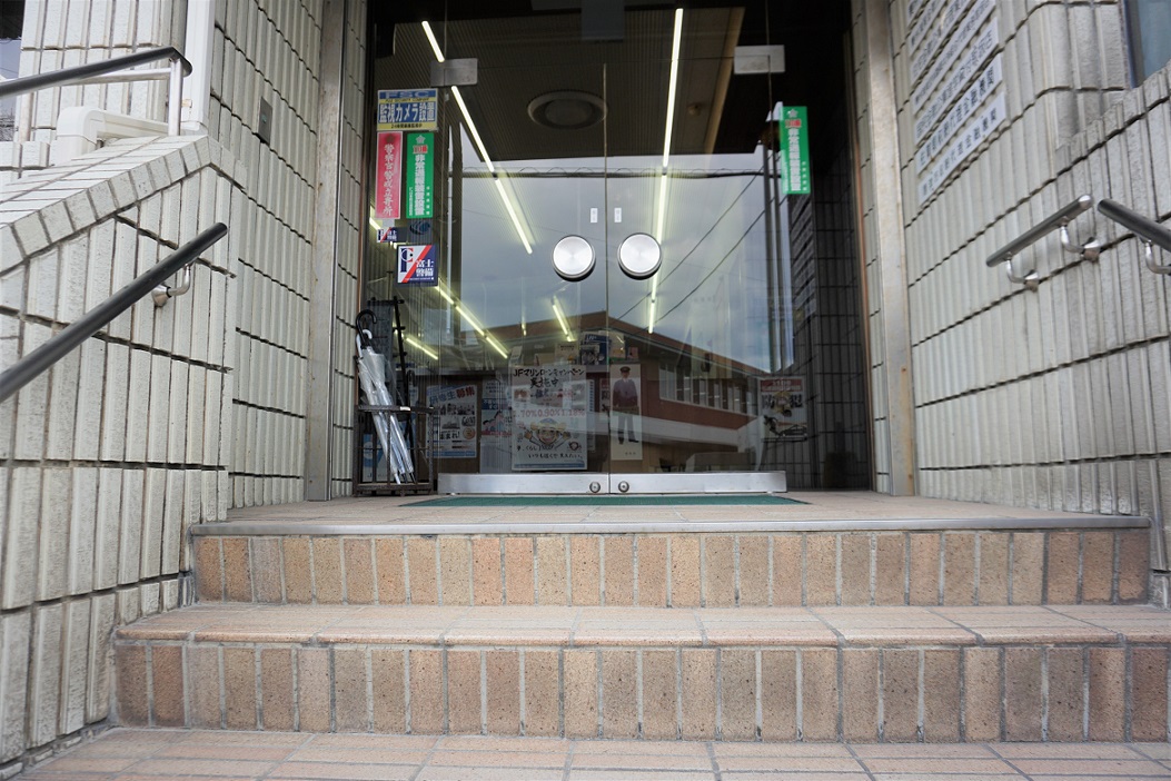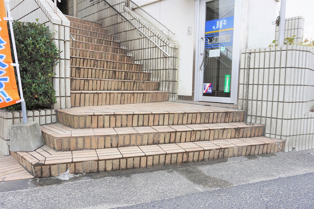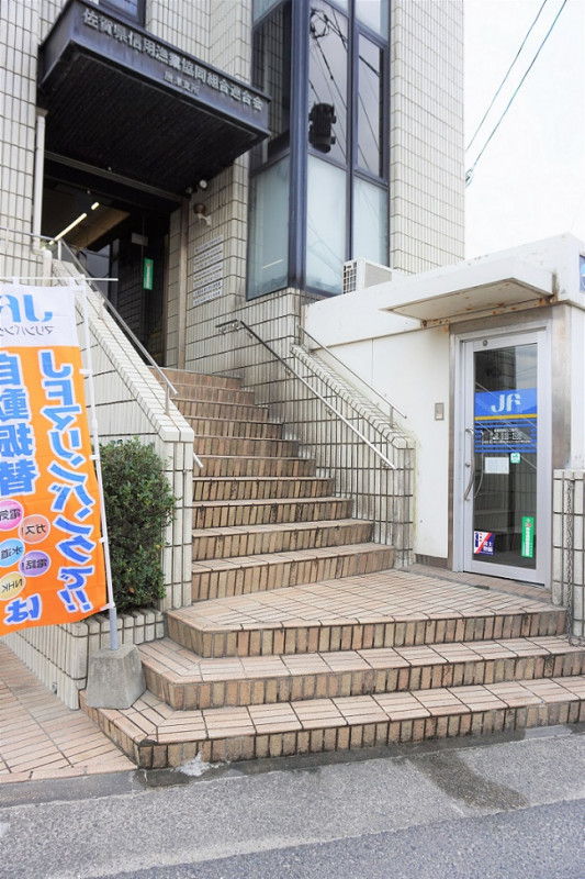 駐車場は建物の地下にあります。窓口は2階にあるため、出入口前は13段ほどの階段になっております。お手伝いが必要な方は、お電話などで一度ご連絡ください。ATMは階段3段目の右側にございます。会議室、トイレはさらに上階にありますのでお写真でご確認ください。R2年度さがすたいるプラス補助金を活用し洋式トイレに改修しました。