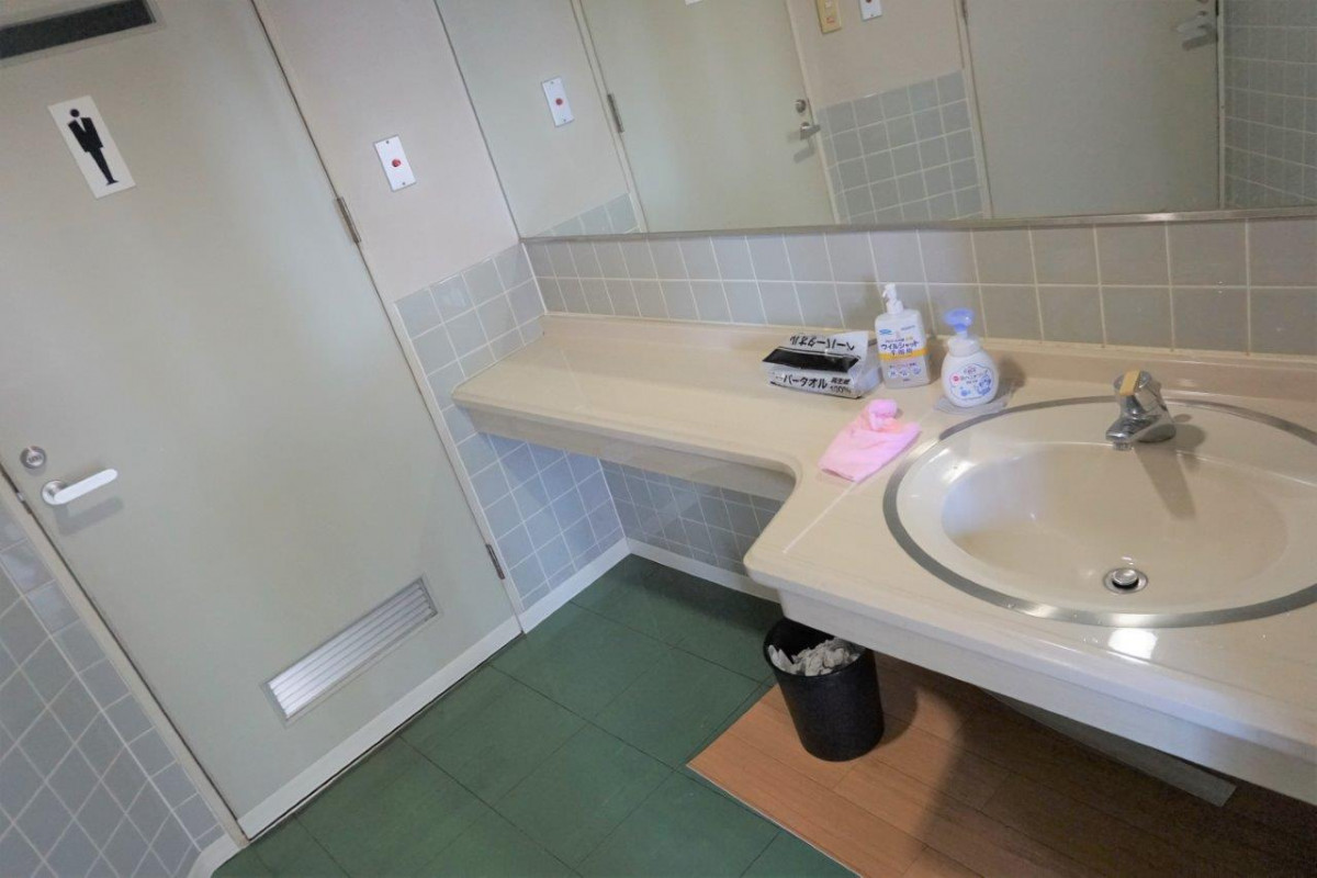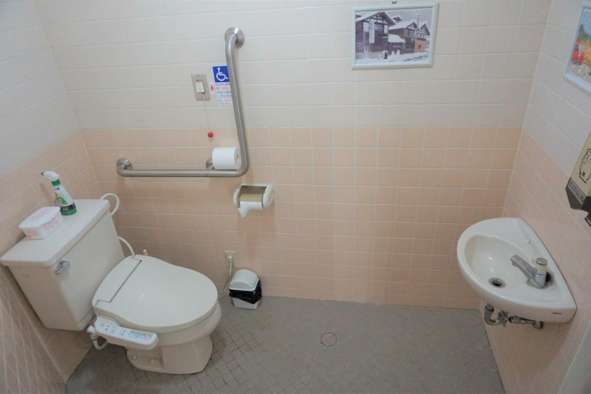 施設入り口すぐに、多目的トイレがあり、ロビーには、いすと机も準備しております。