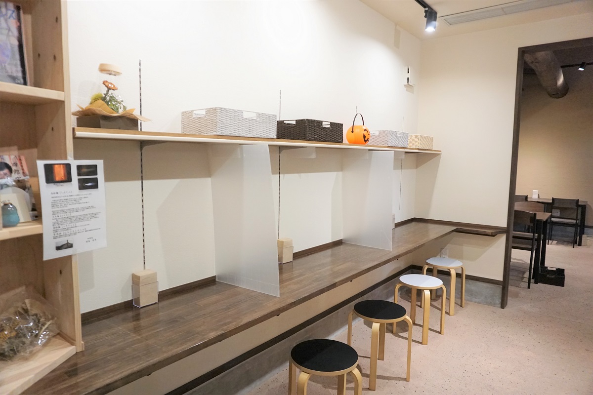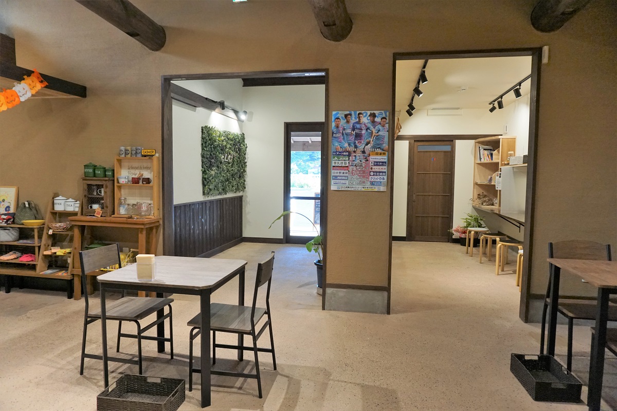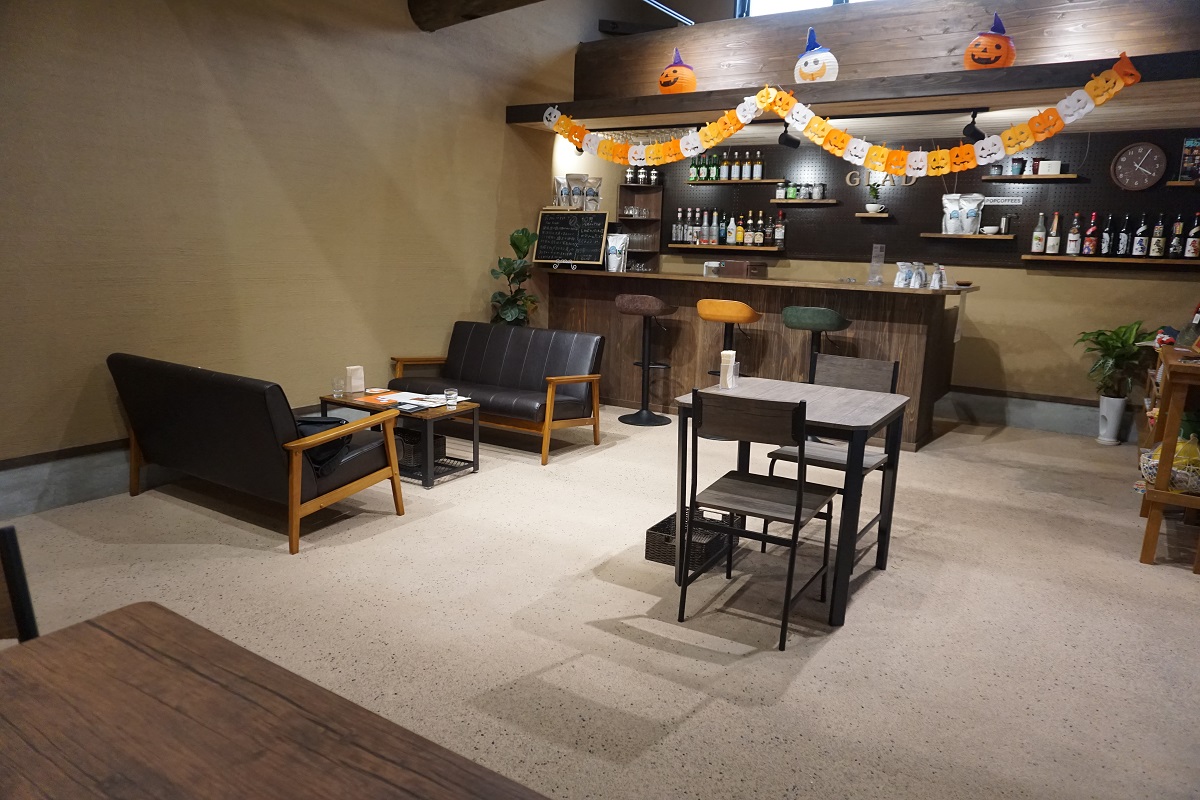 店舗前は道が細いため、交通に十分にお気を付けください。駐車場は店舗横(舗装なし)にあります。店内はフラットで、広く開放的です。勉強やテレワークなどに利用しやすいカウンター席もございます。店舗の裏には人工芝のあるスペースがあり、テラス席になる予定。テイクアウトの利用も可能です。