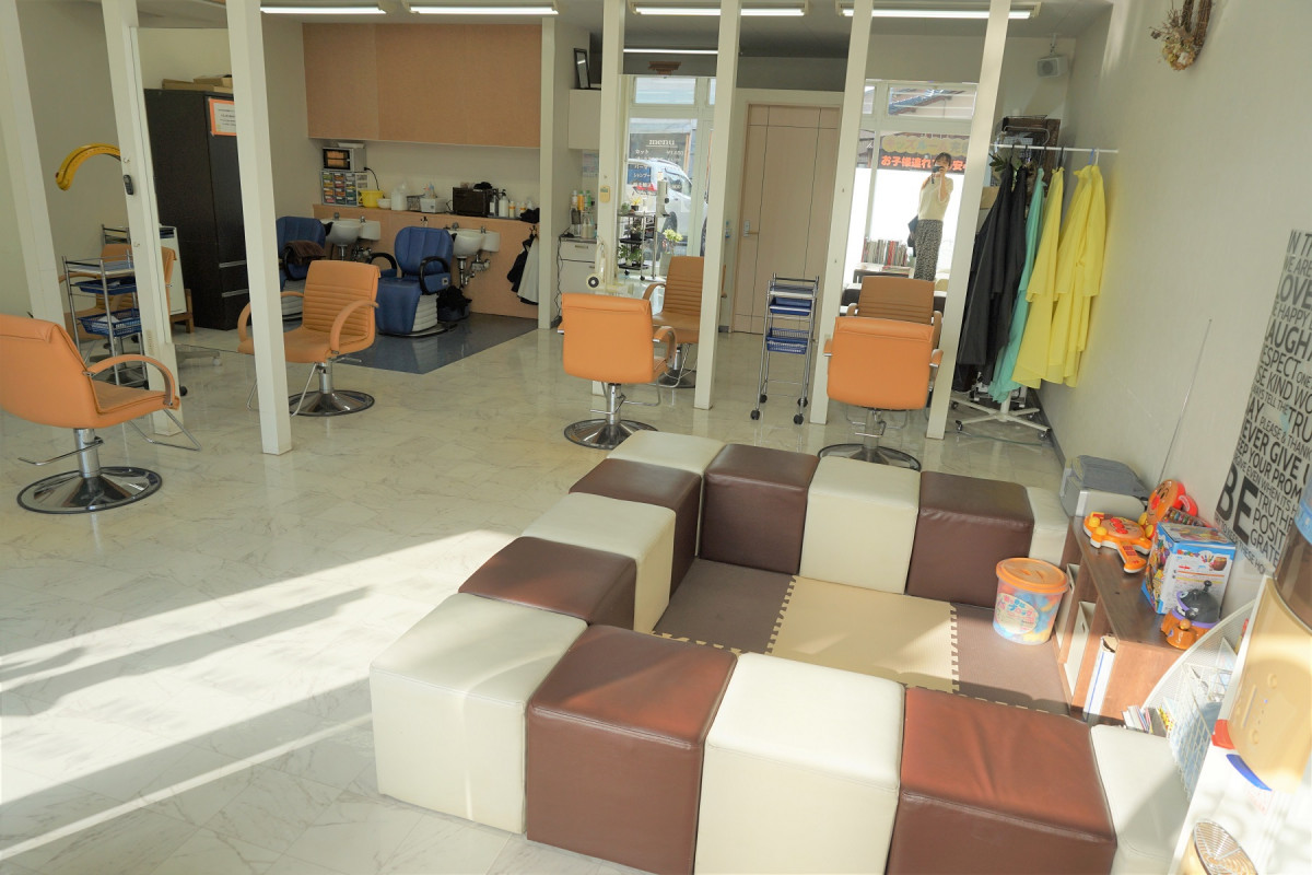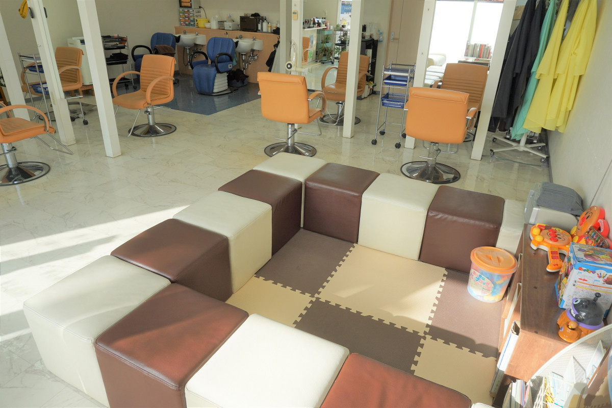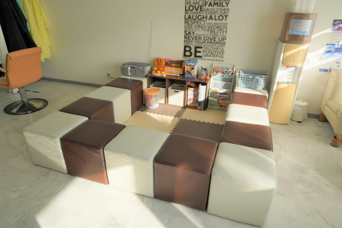 お子様連れも安心して、美容室に来ていただけるように、キッズスペースを準備していますので、お子様を見守りながら施術を受けていただけます。絵本やおもちゃなど準備していますので、お子様も飽きずにお待ちいただいています。