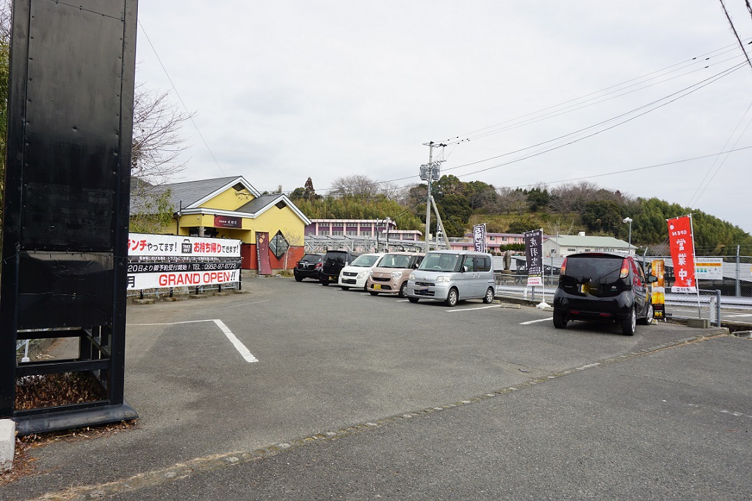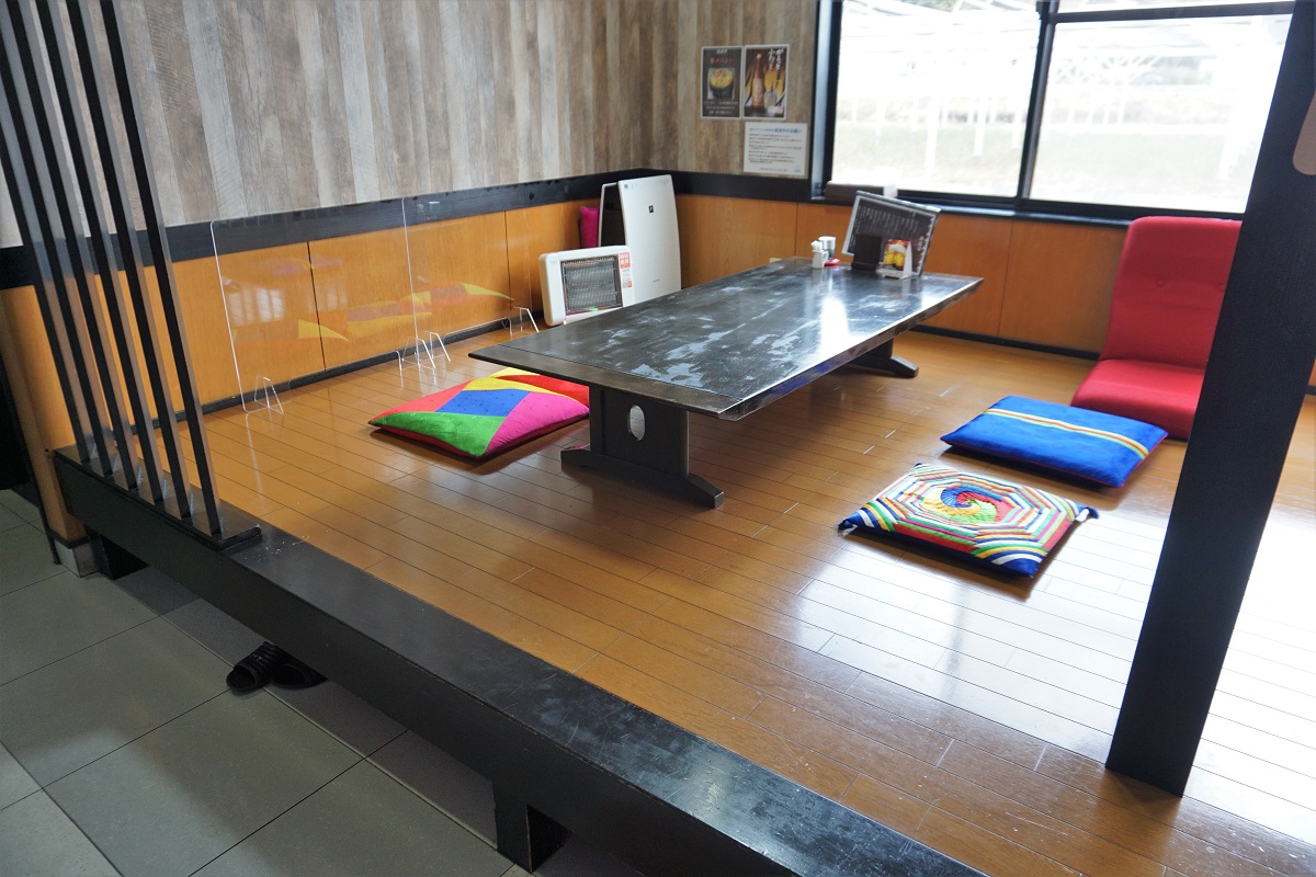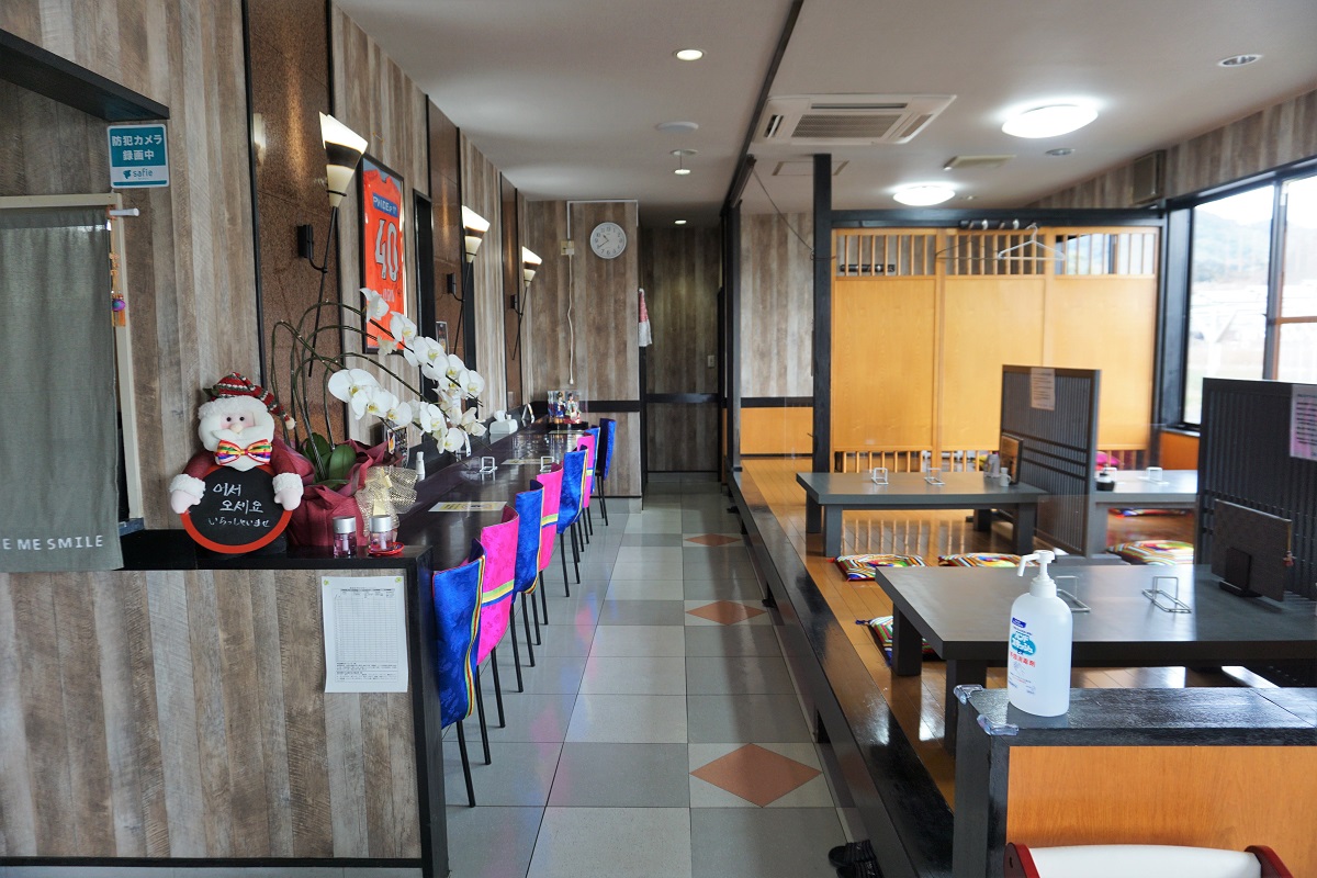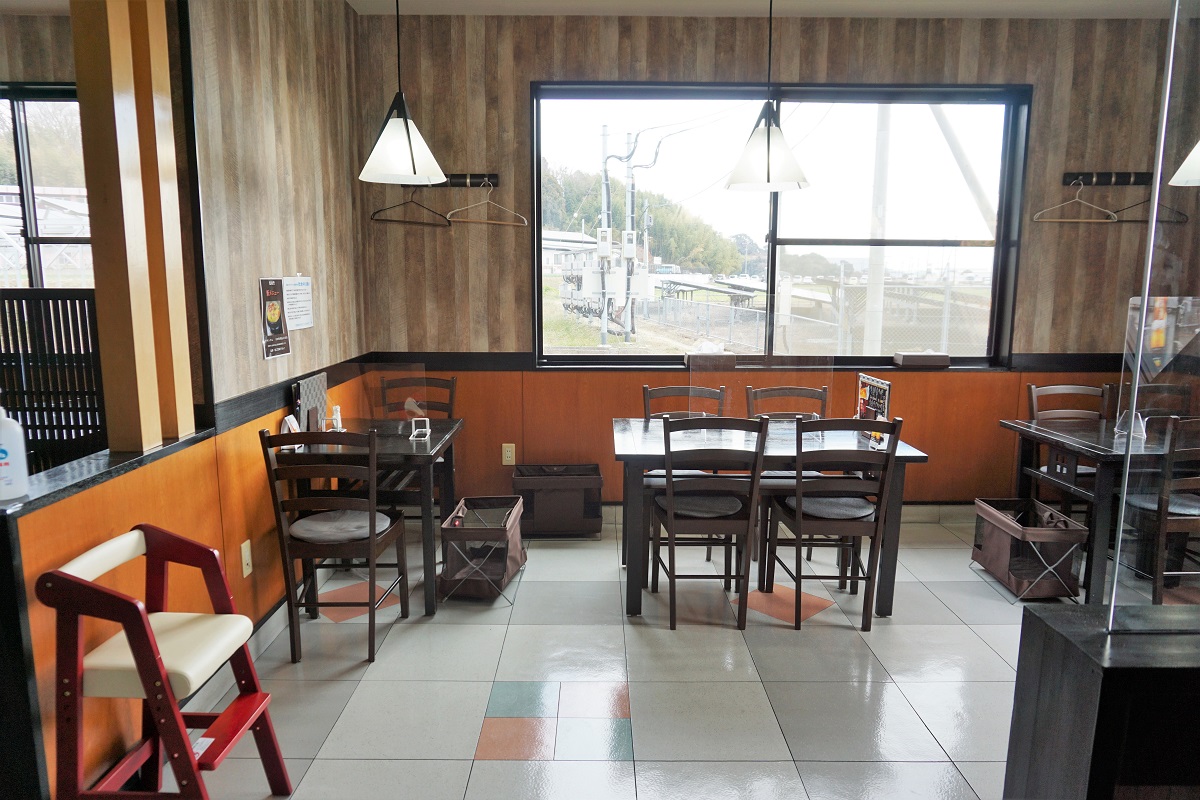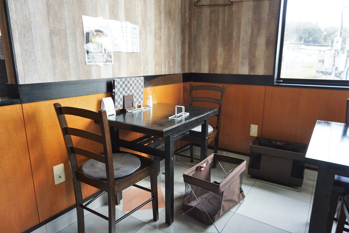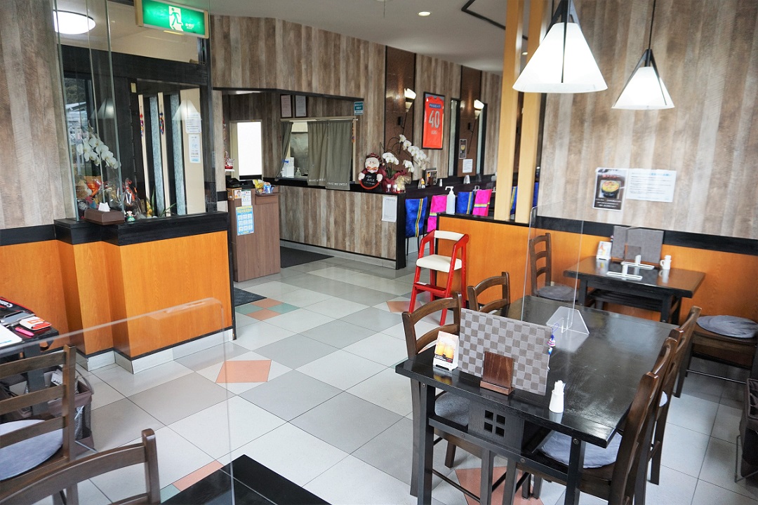 第1駐車場は店舗前にあります。第2駐車場は舗装はありませんが、大型車の駐車(要事前連絡)も可能です。入口までに段差が1段あります。店内はフラットで、テーブル席、カウンター席、小上がりのお座敷があります。ベビーカー利用や車いすでのご利用も可能です。