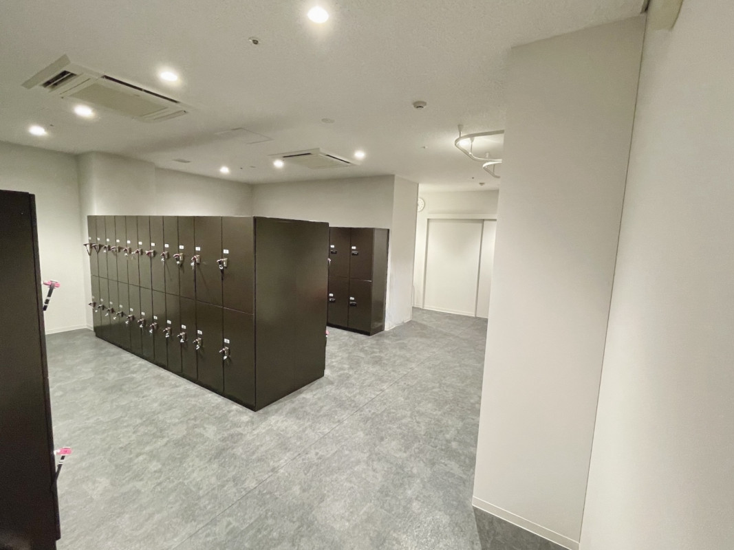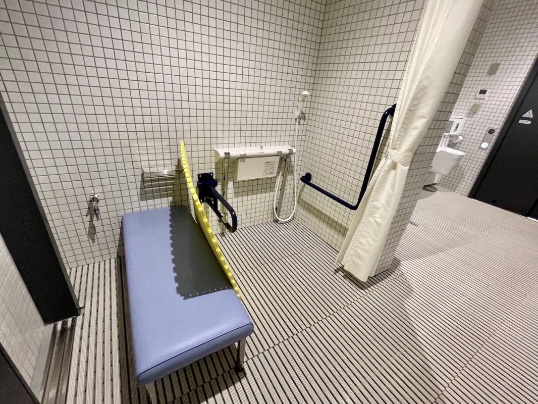 多目的更衣室には、車いすのまま浴びることができるように、