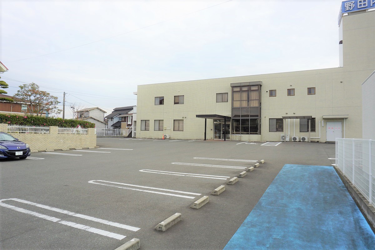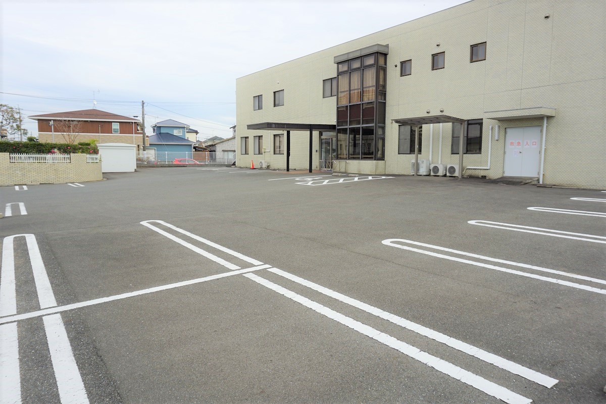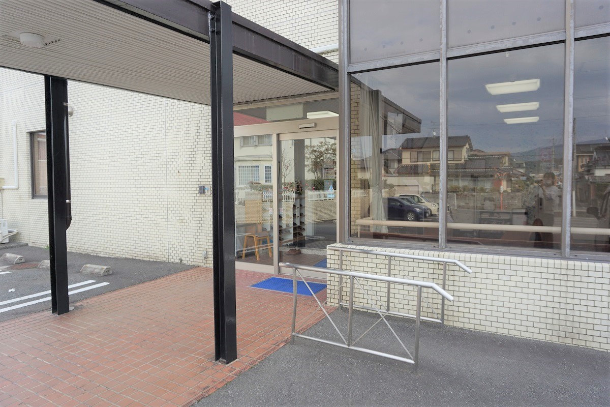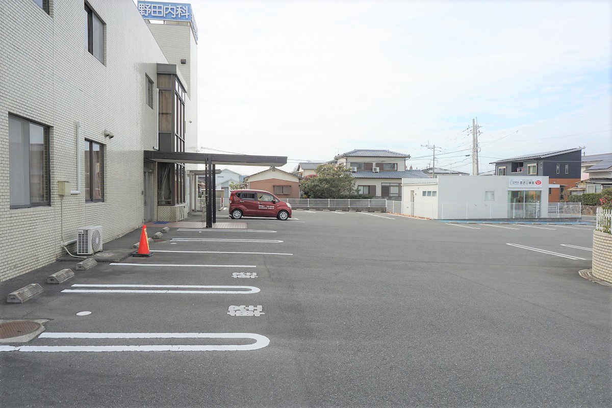 バリアフリー駐車場があり、出入り口前には屋根を設置しています。