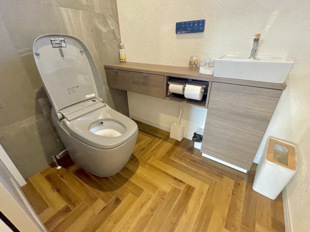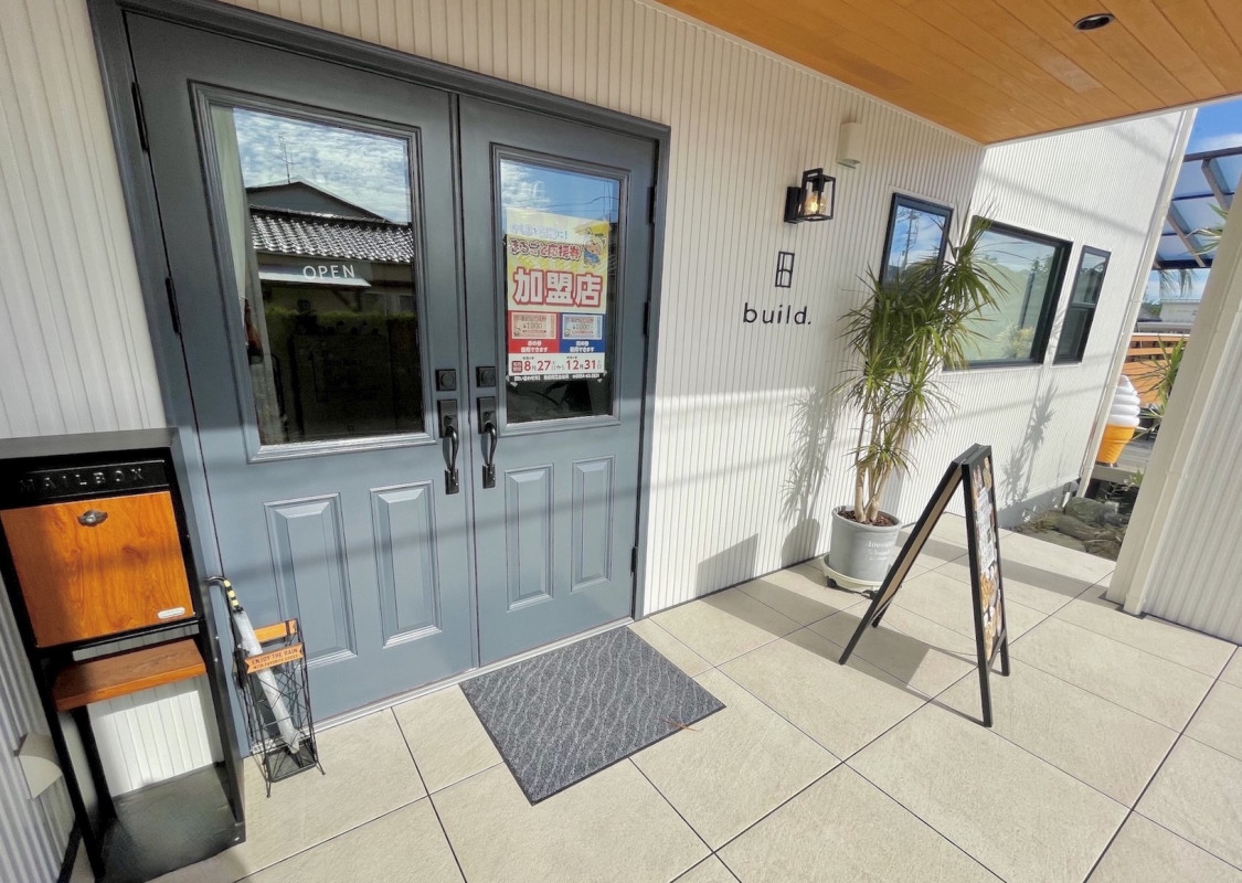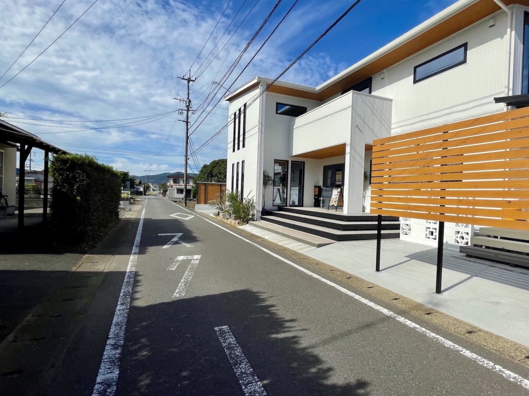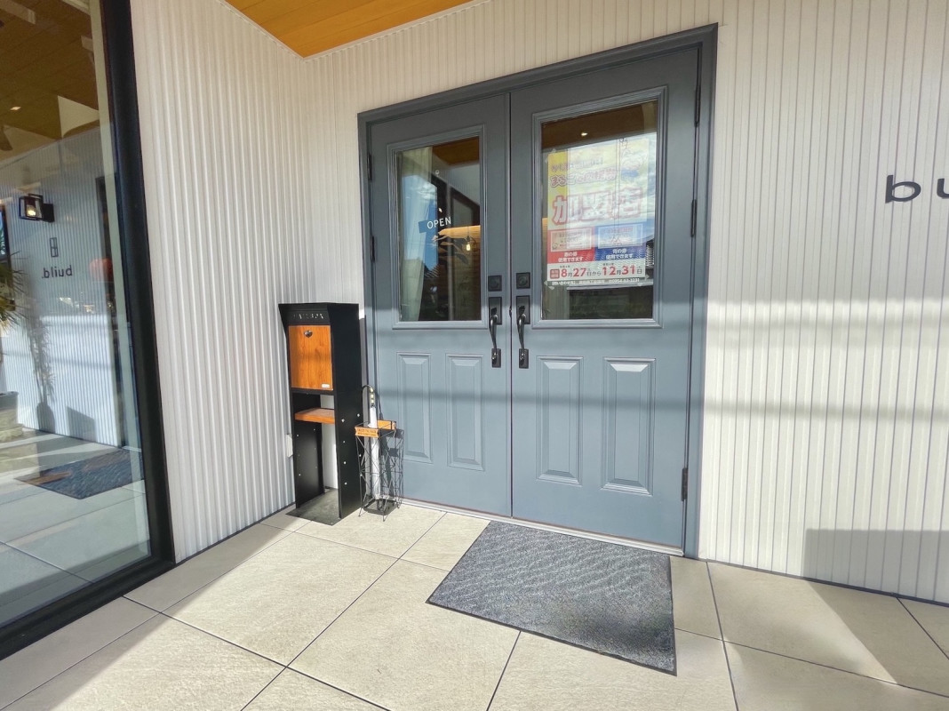 出入り口は正面とテラス席側の2箇所あり、どちらも階段がございます。