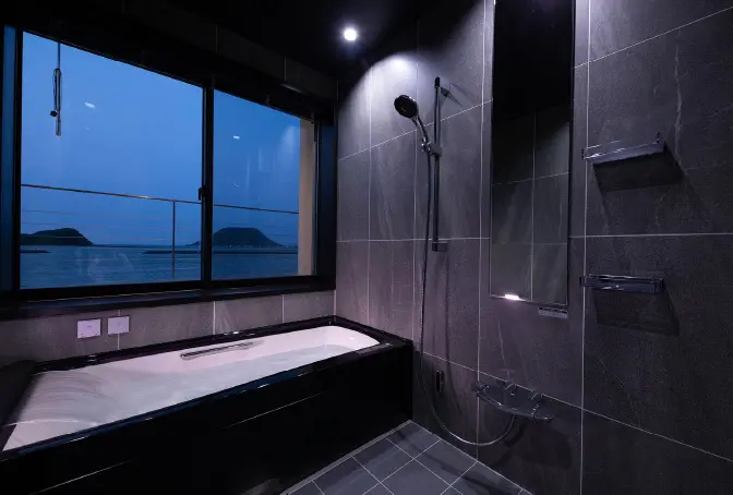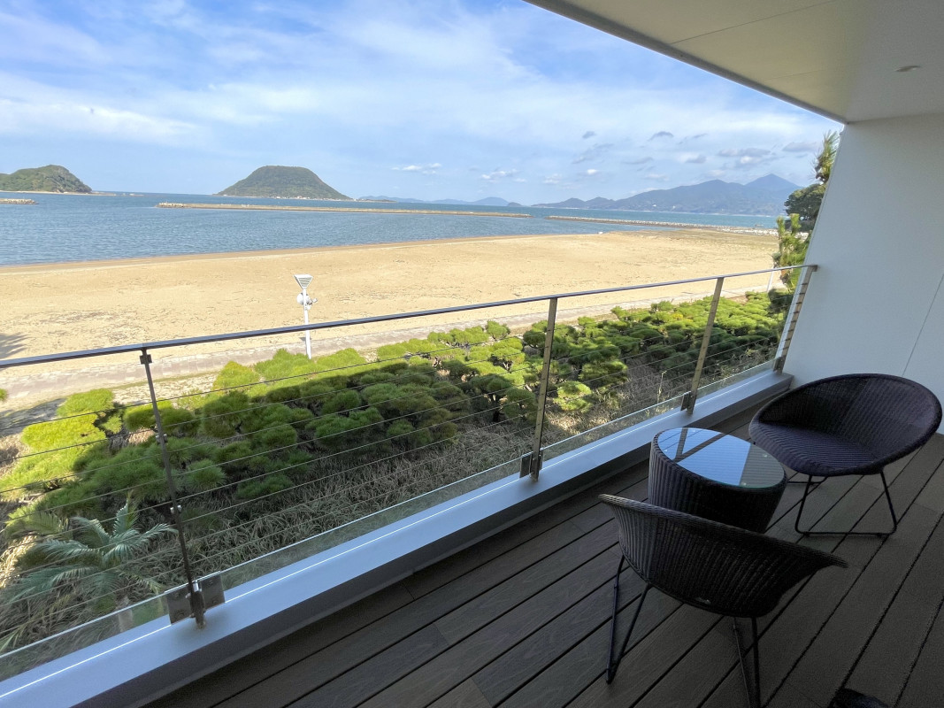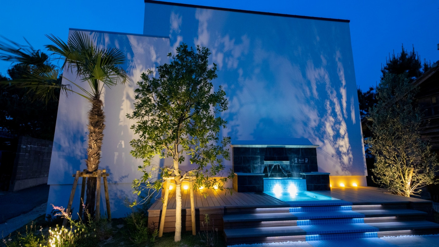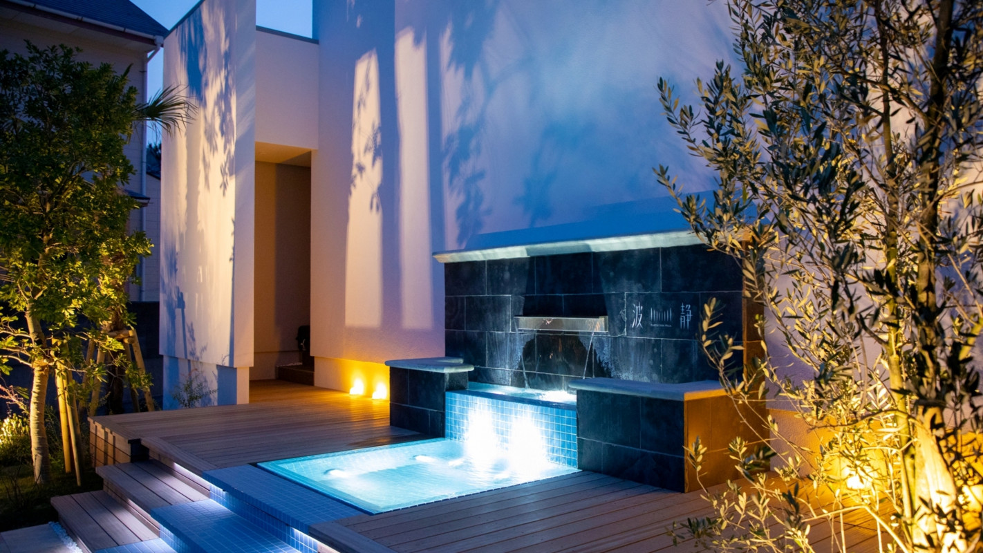 夕方には、ライトアップされた水盤にゆれる水を眺め、波の音に耳を傾ける。