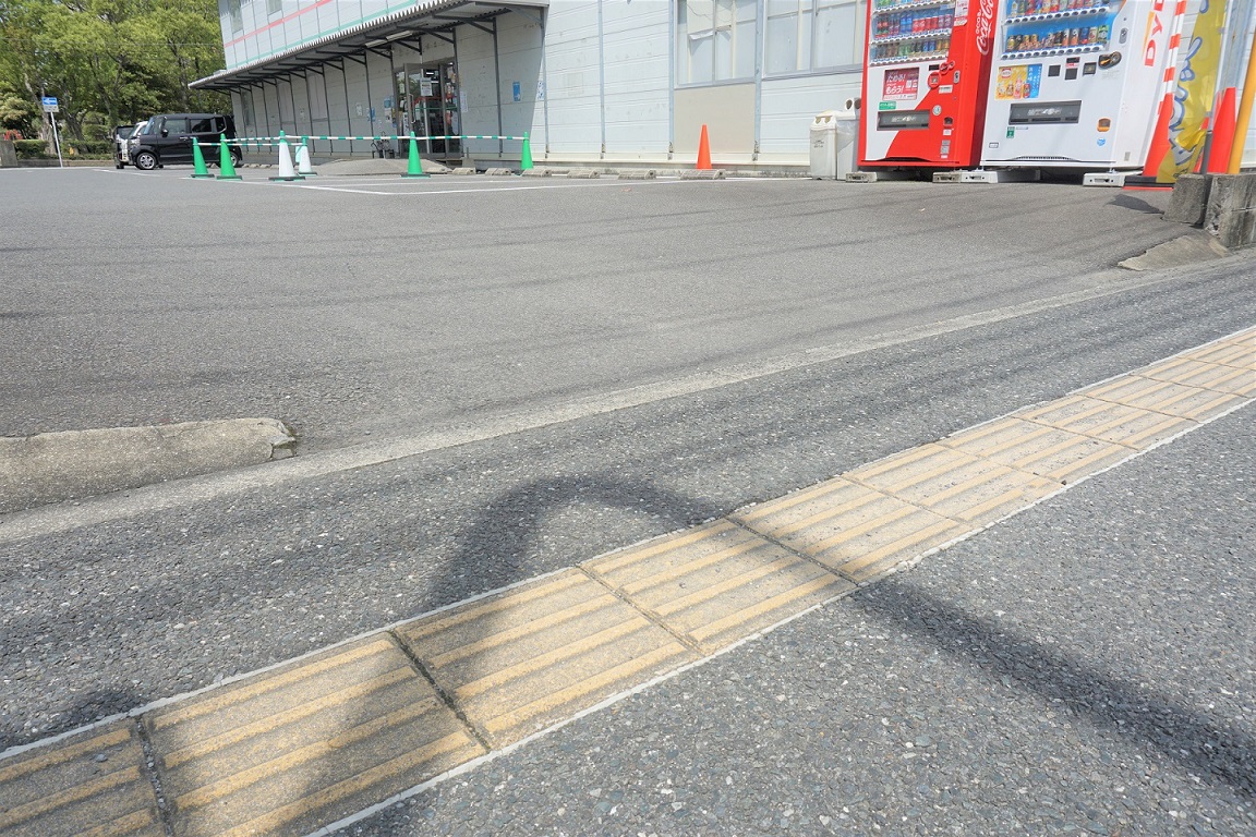 スロープ横の緑のコーンで囲まれた箇所は駐輪場となっております。