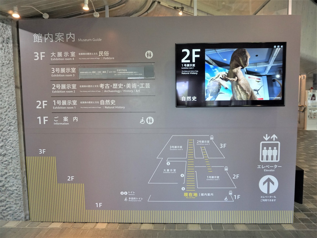 2階には1号展示室「佐賀県の歴史と文化/自然史」、3階には2号展示室「佐賀県の歴史と文化/原始・古代~中世」・ 3号展示室・大展示室「佐賀県の歴史と文化/民俗」がございます。