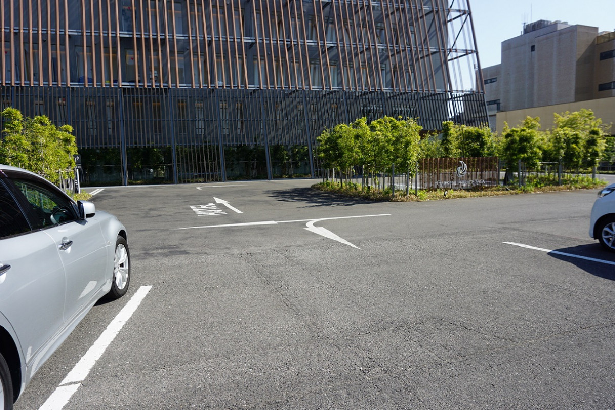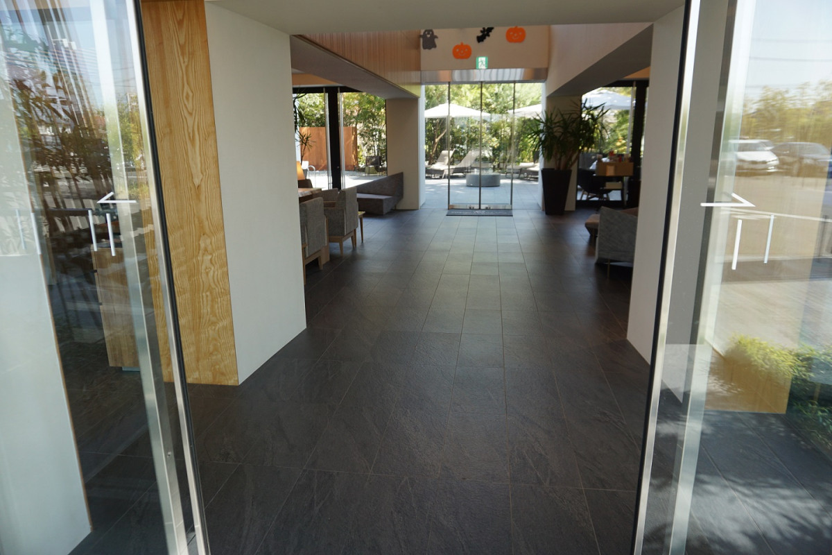 幹線道路から少し離れた、現代建築のエレガントなホテル。