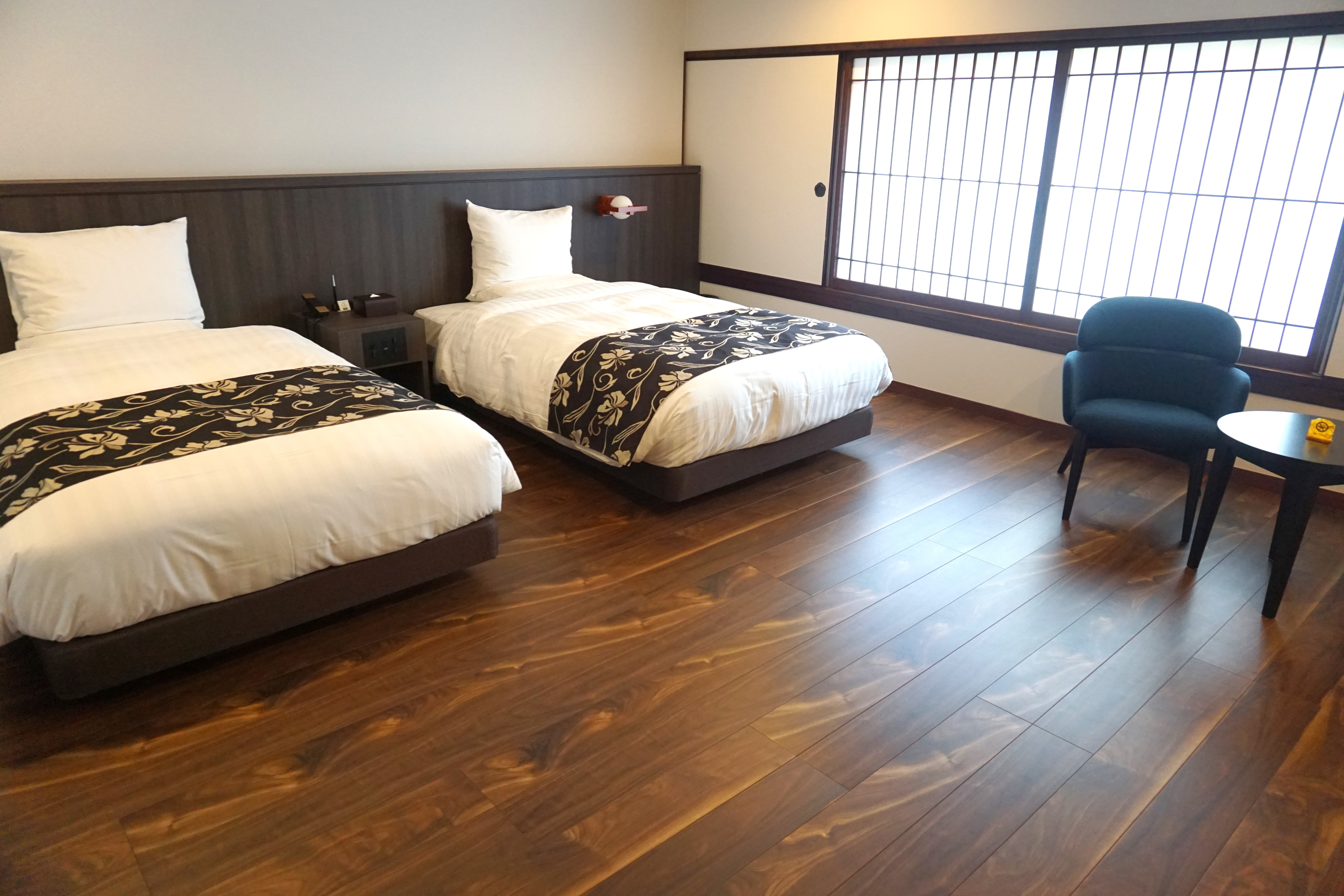 木の温もりに包まれた客室は、上質で重厚な宿全体の世界観とも調和をなし、一方でさりげなく配された和の要素は、どこかほっとする懐かしい安らぎを与えてくれます。