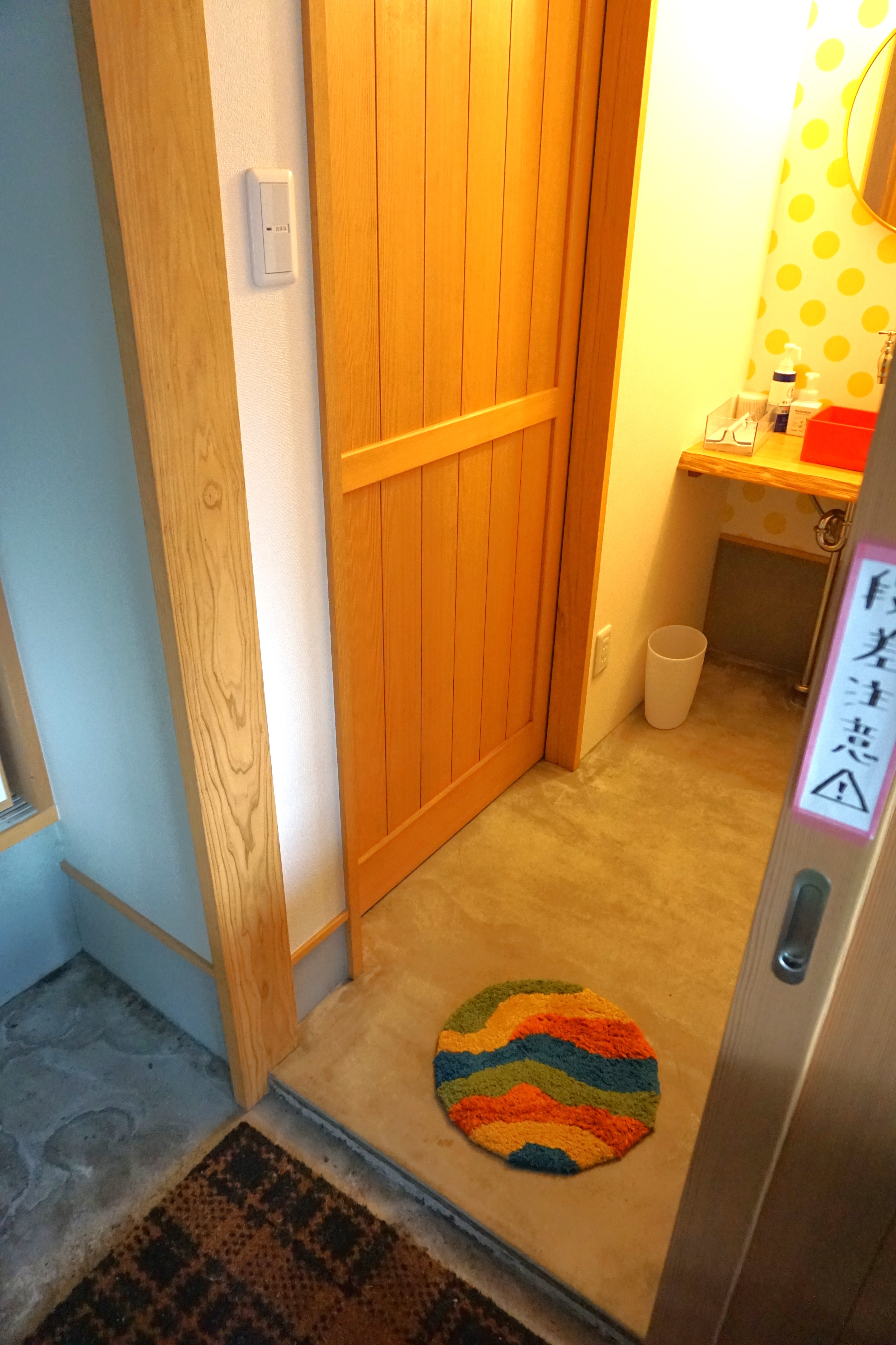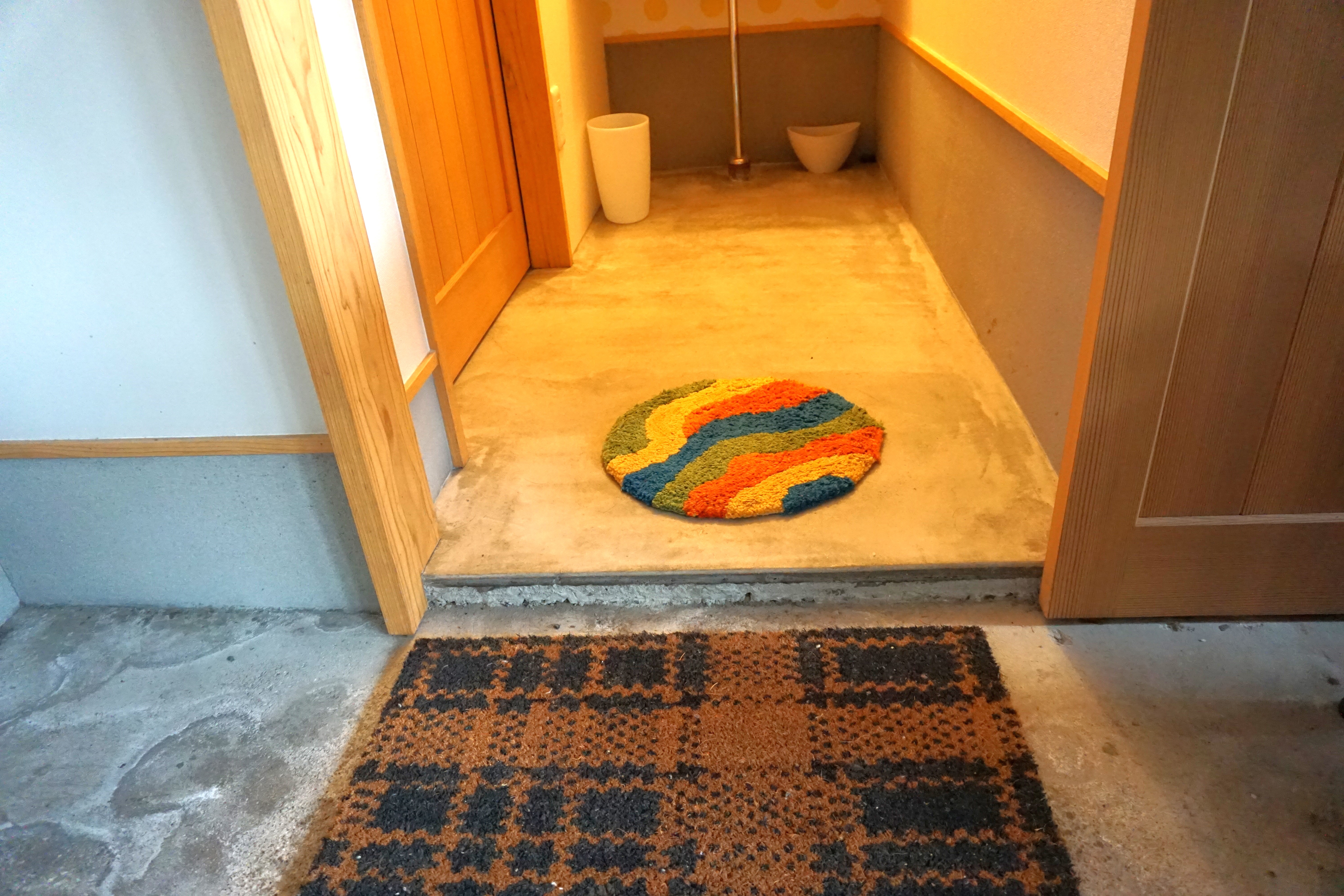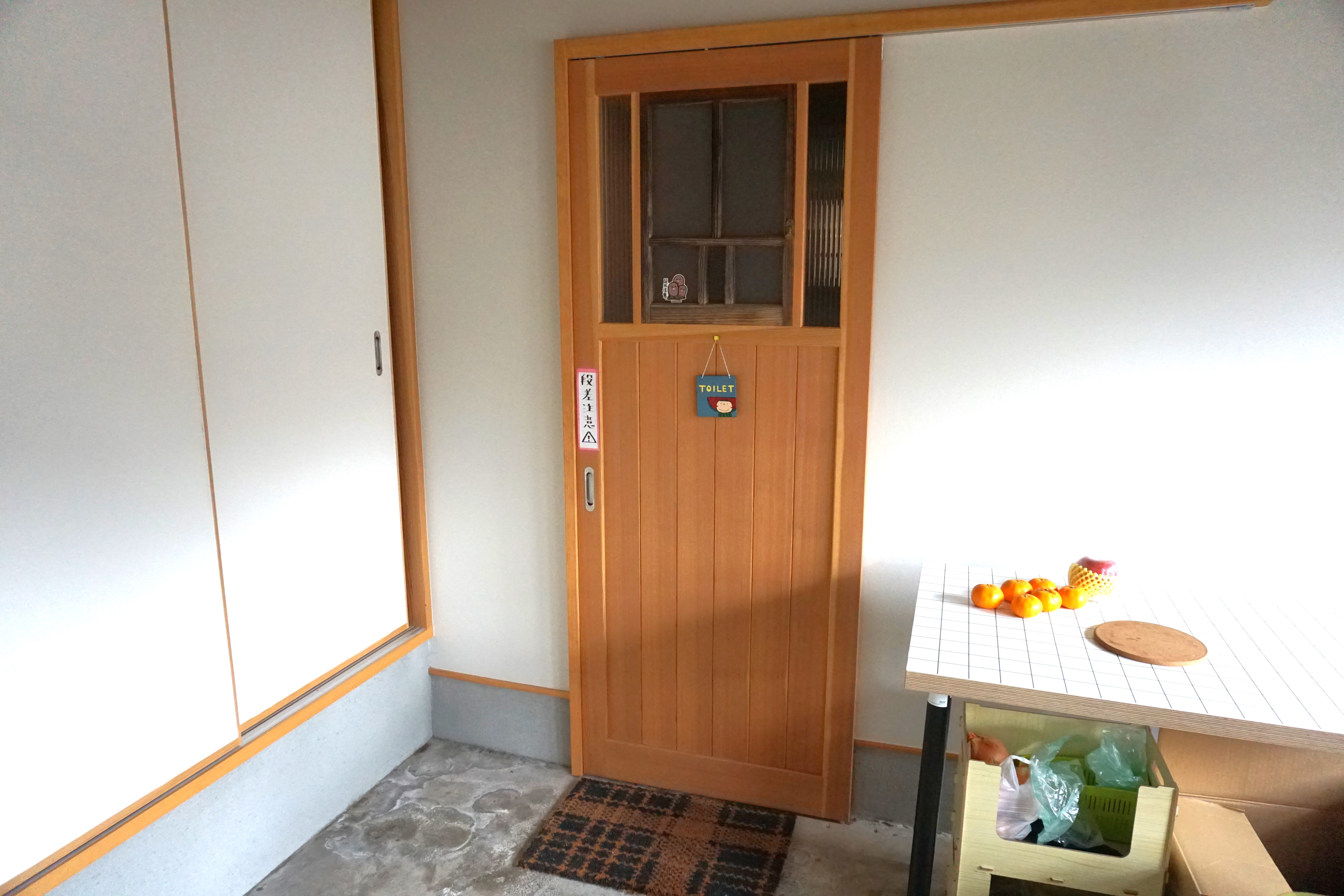 トイレまでの通路に下に下がる階段が2段、トイレ出入口ドアオープン時に1段の段差があります。