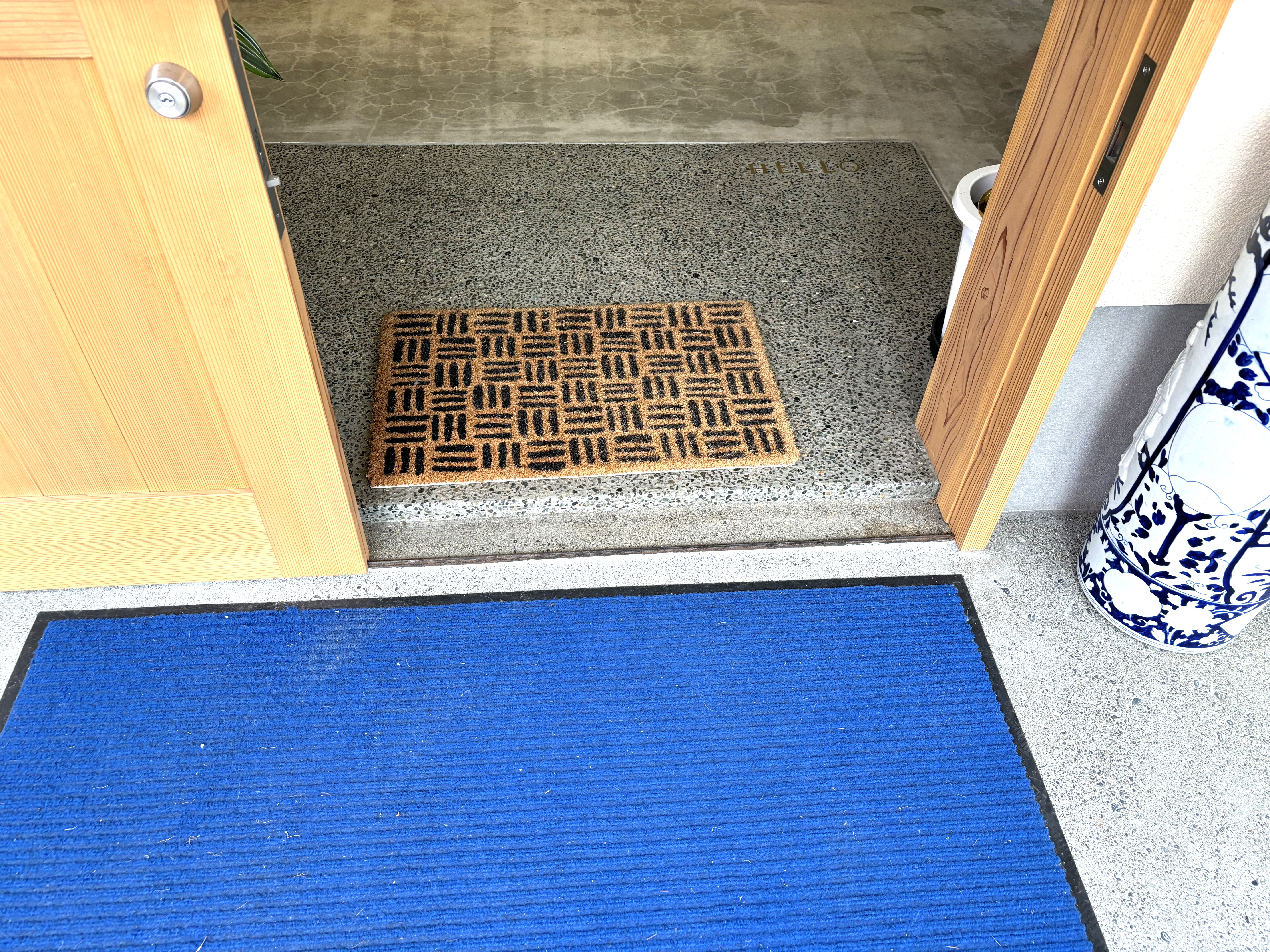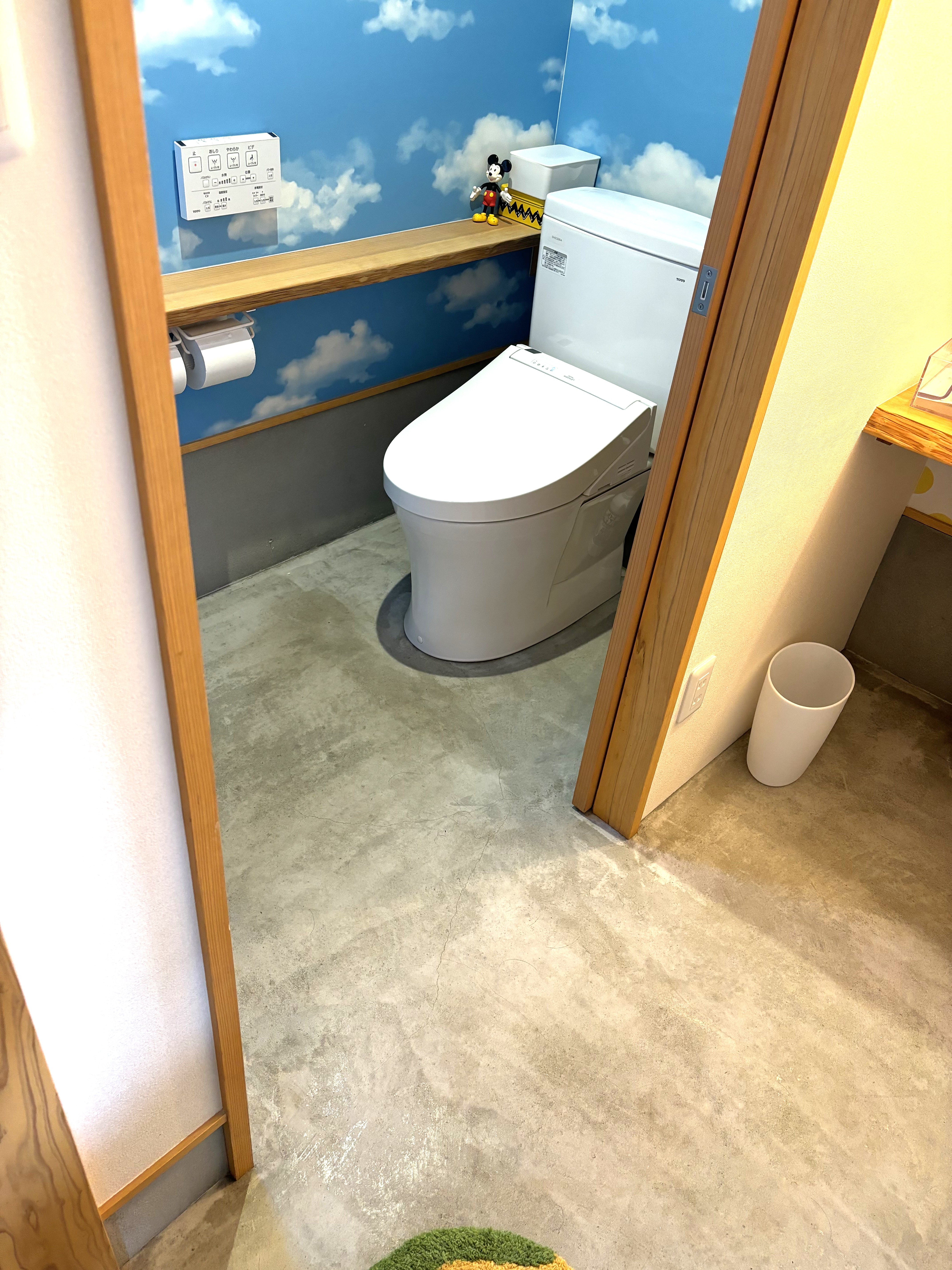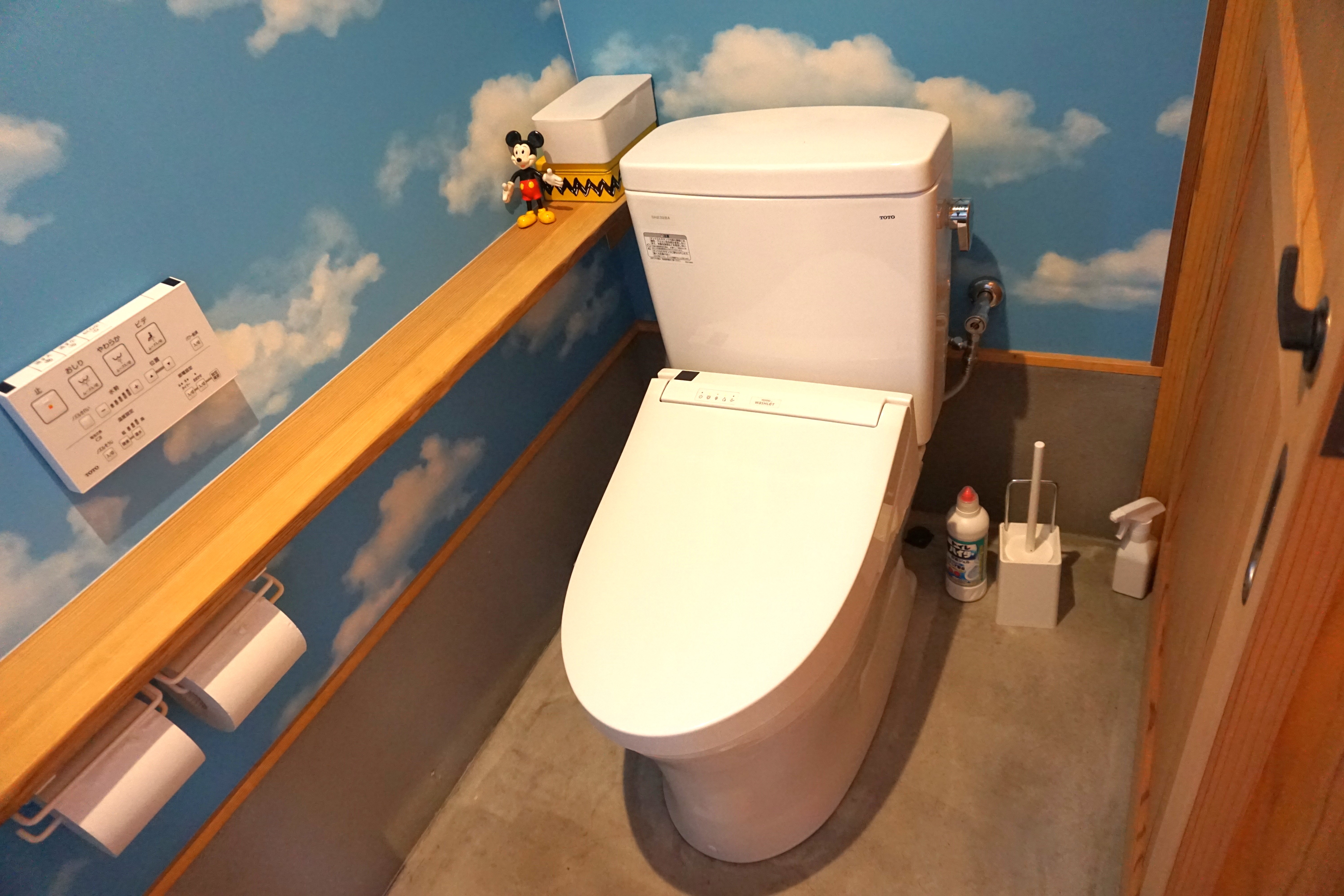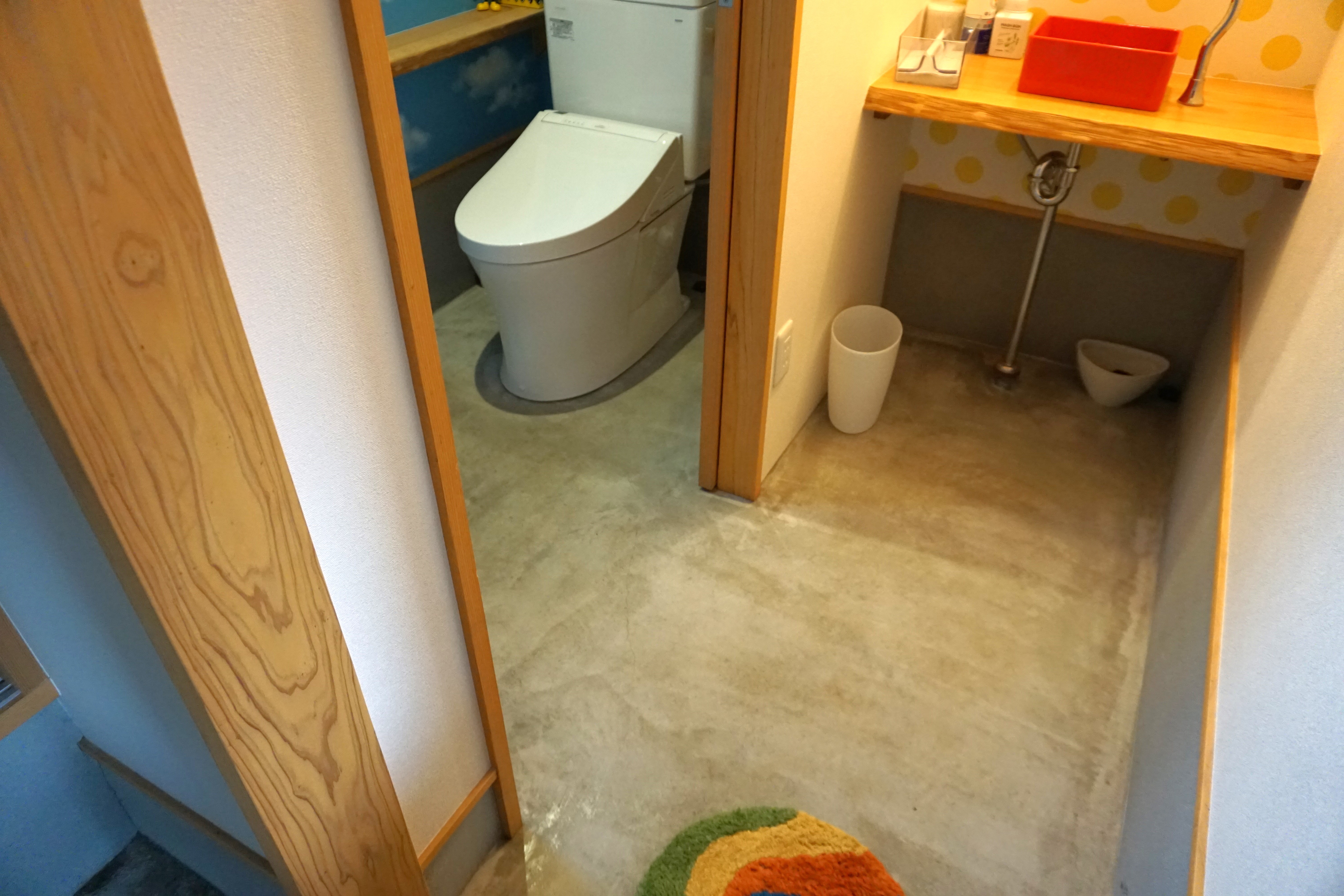 トイレまでの通路に下に下がる階段が2段、トイレ出入口ドアオープン時に1段の段差があります。