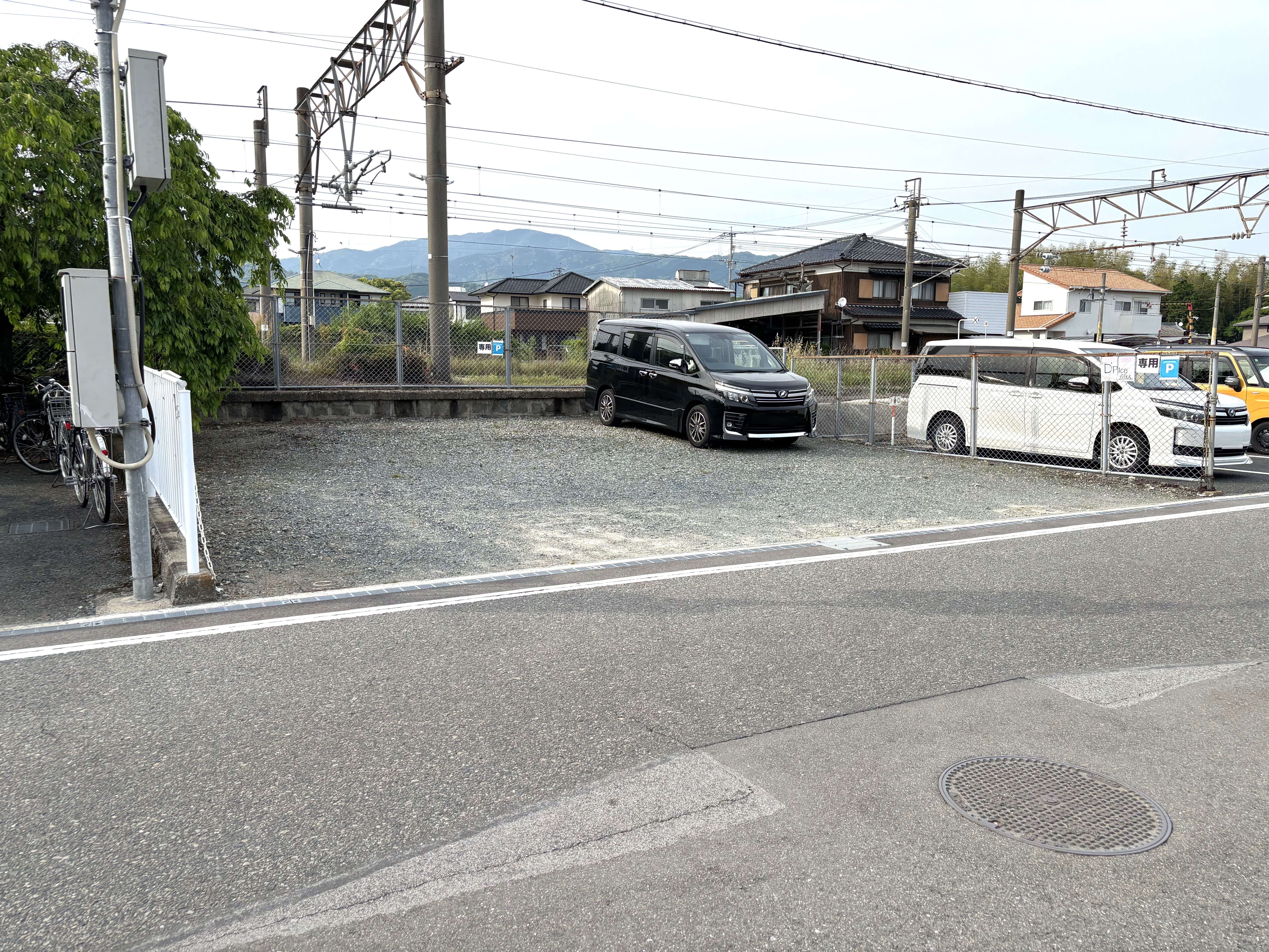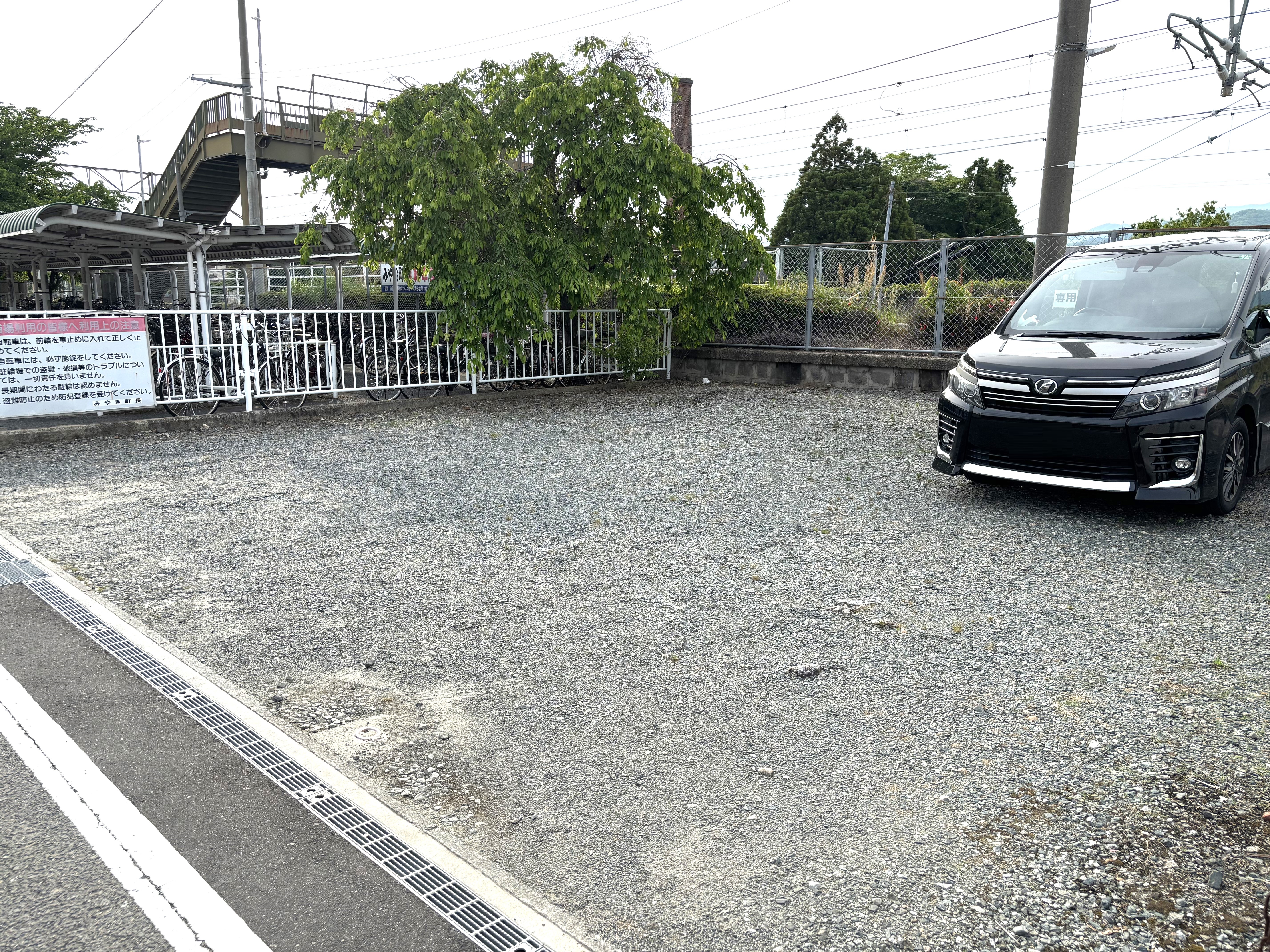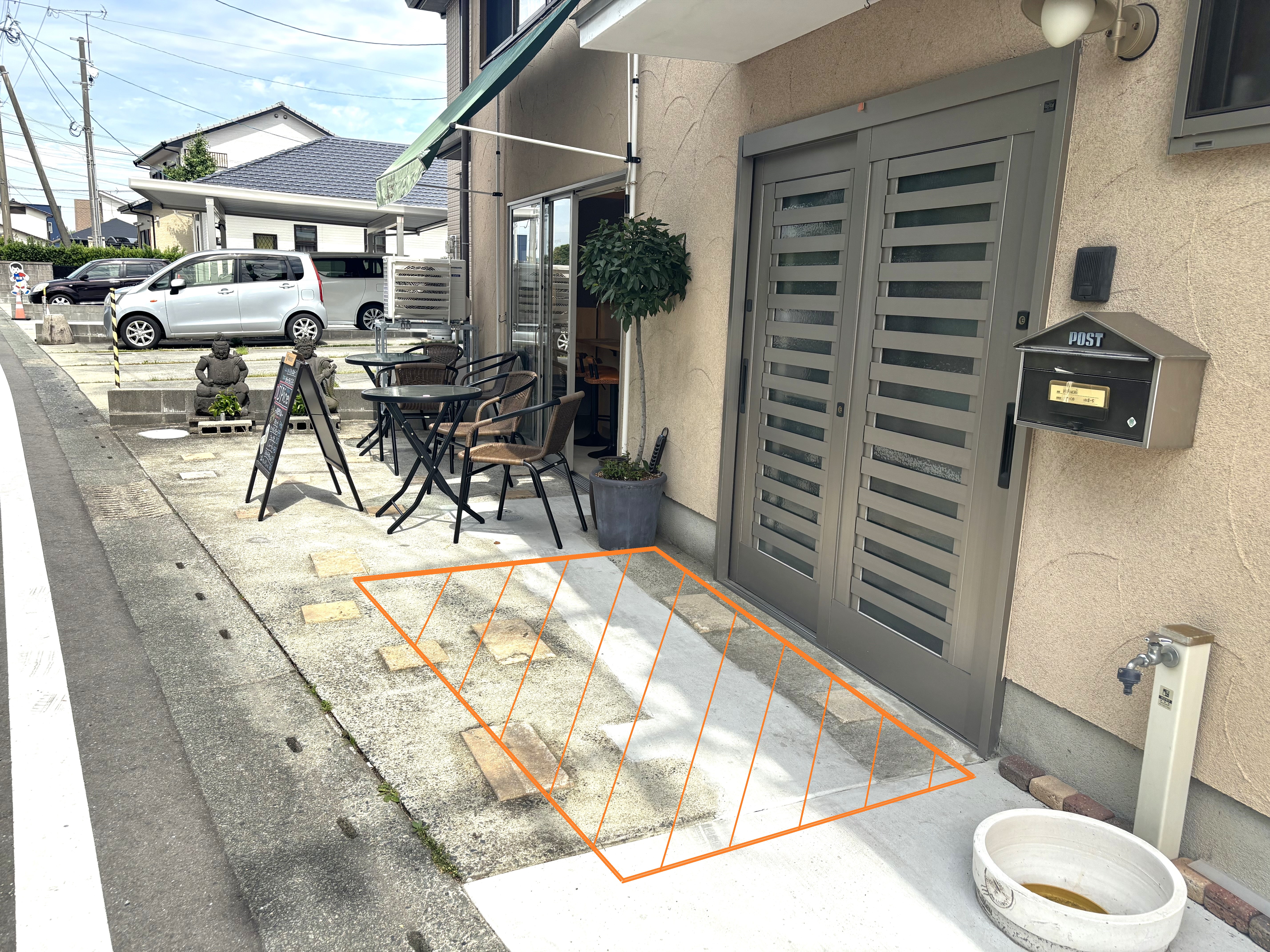 店舗出入口ヨコスペースに軽が1台、砂利スペースに4台停めることができます
