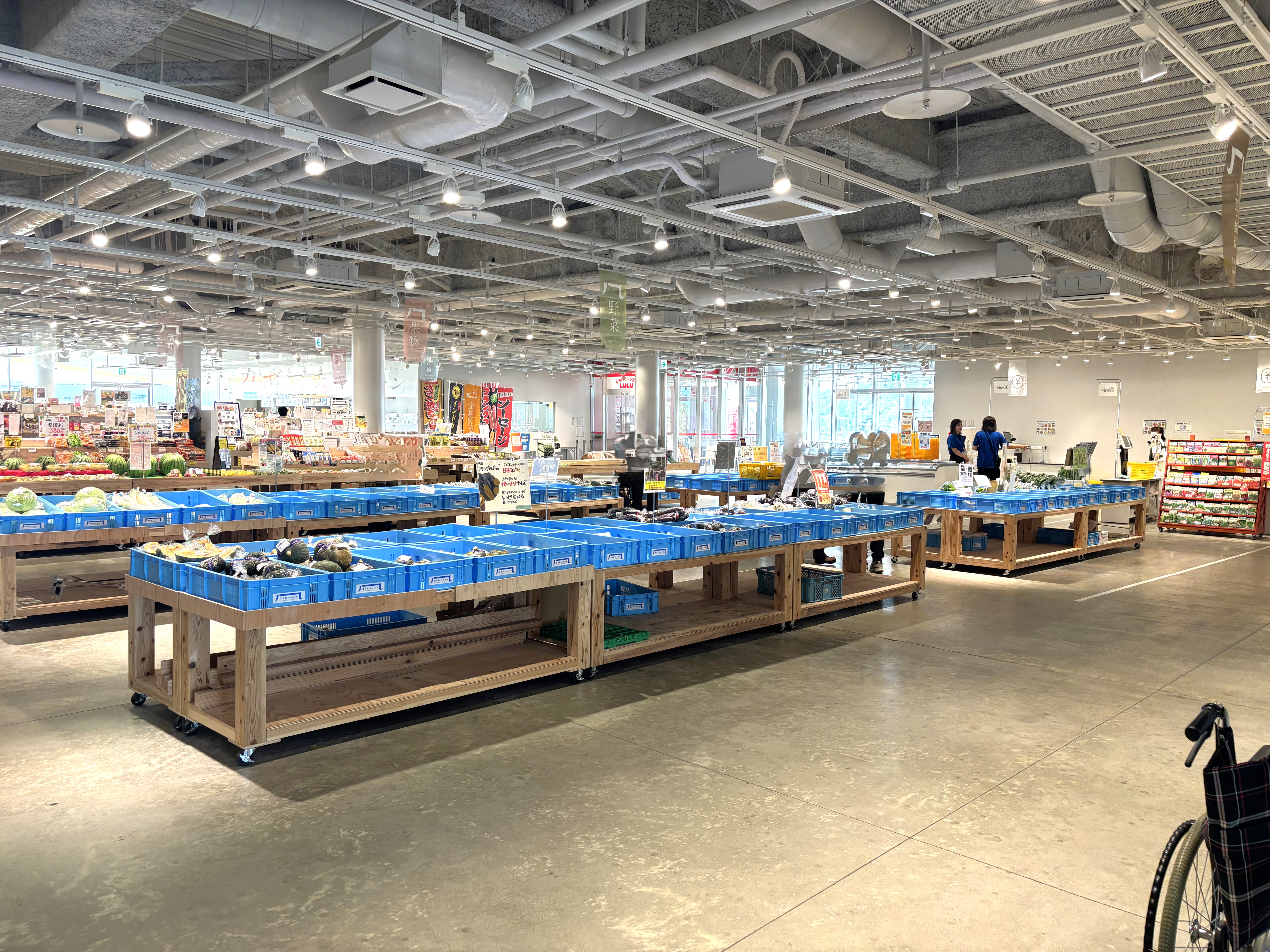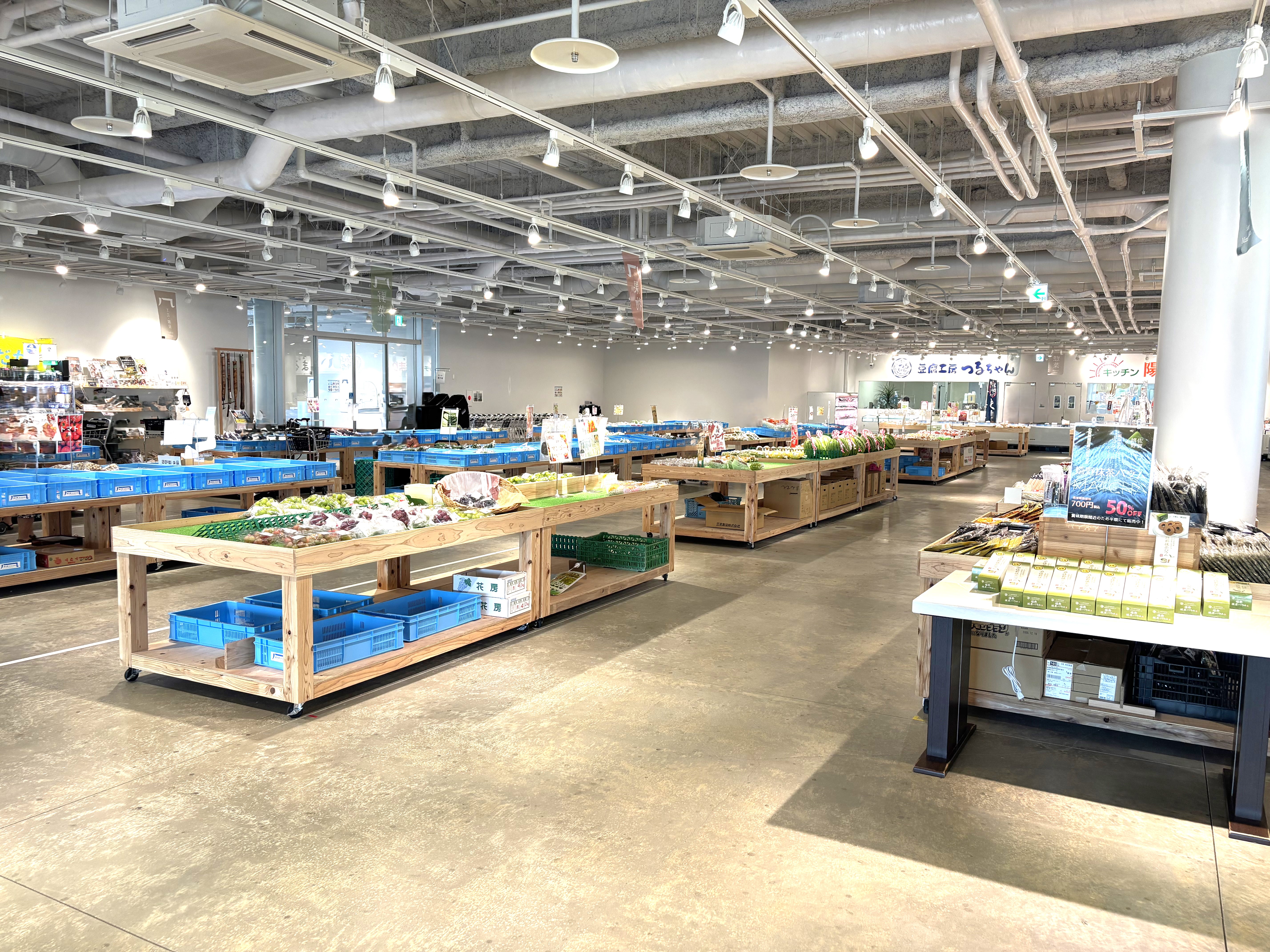 直売所には新鮮な農作物や精肉が並び、魅力的なメニューあふれるフードコートやグルメが揃うテナントエリアなど、県内最大級の規模を誇ります。