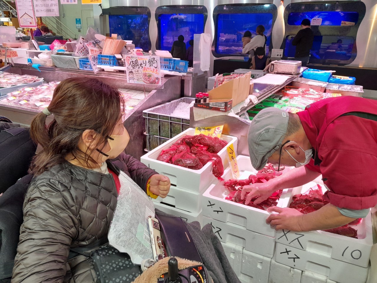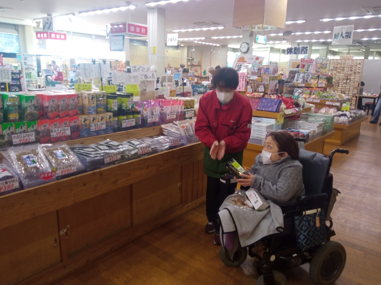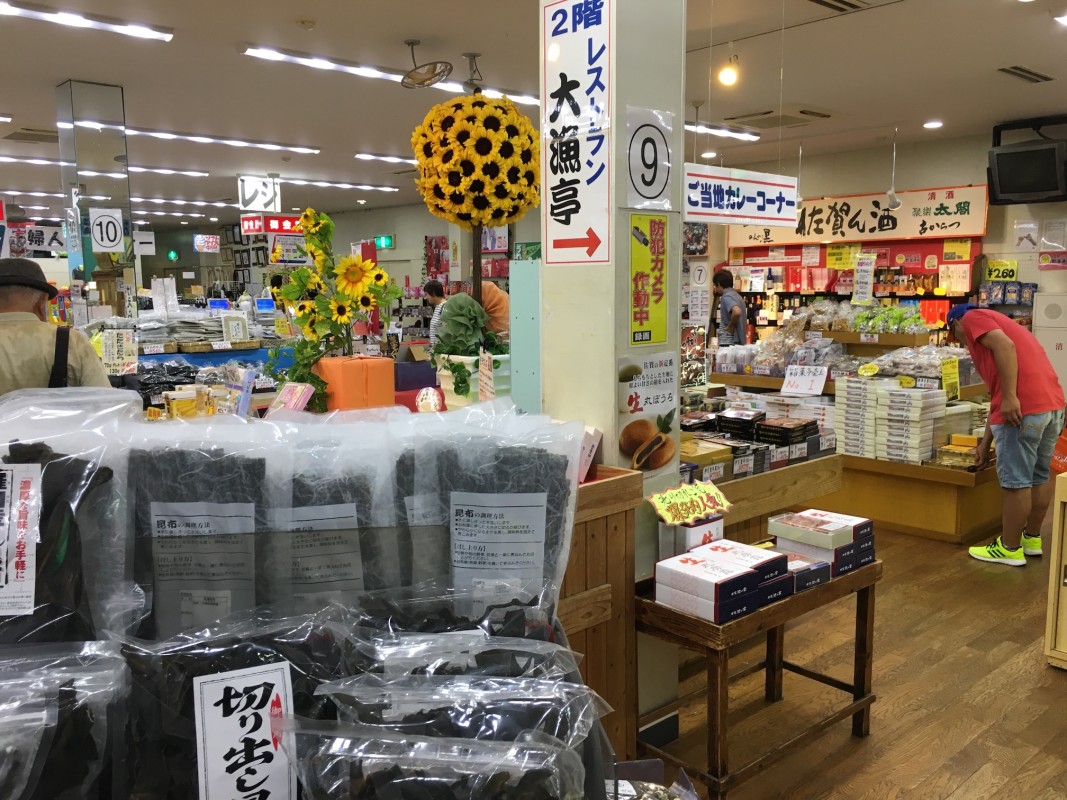 1階は、海産物やお土産品の販売を行っています。バリアフリーなつくりになっていますのでどなた様でもお買い物をお楽しみください。